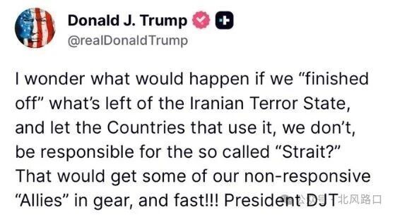 3月18日,他在社交媒体上表示: “我在想,如果我们‘彻底解决’剩下的伊朗XX郑泉,然后让那些真正依赖这个海峡的国家——我们并不依赖——去负责这个所谓的‘海峡’,会发生什么?” “那样会让我们那些反应迟缓的‘盟友’迅速行动起来,而且会很快!!!”