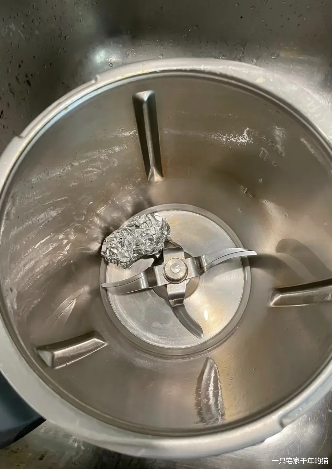不仅是水龙头,像家里平常用的不锈钢碗盆,不锈钢水槽,甚至是破壁机里的污渍,都可以用锡纸来清洗。