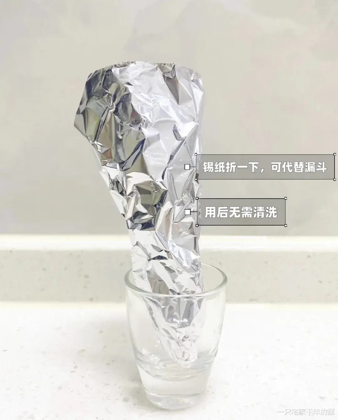 拿一张锡纸折成三角形,把锡纸边折起来,最后再底部剪一个口,一个简易漏斗就制作完成了,可以适配各种大小不同的瓶口。