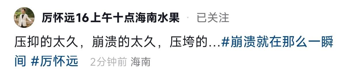 然后厉怀远拿出了自己惯用的手法:卖惨、示弱、博同情。他发视频说冰冻三尺非一日之寒,自己是被压抑的太久,已经到了崩溃的边缘,冷暖自知,自己也不想多说什么。