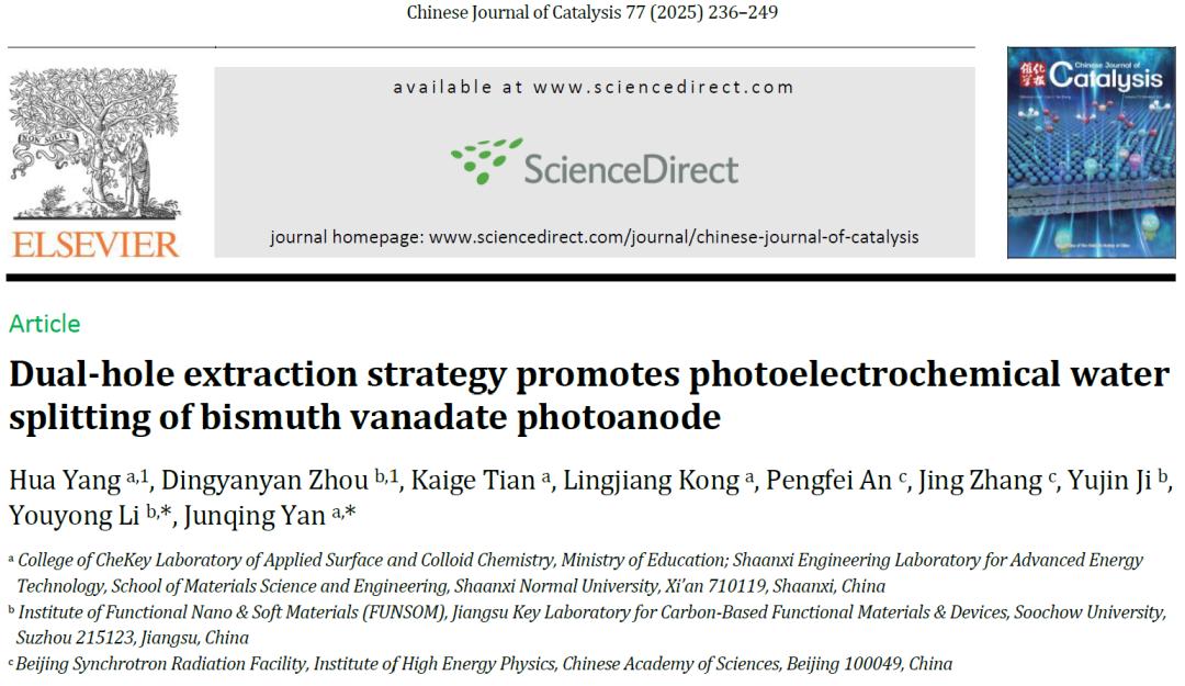 近日,《催化学报》在线发表了陕西师范大学闫俊青教授和苏州大学李有勇教授团队在光电催化分解水领域的最新研究成果文章。该工作报道了一种通过铯掺杂诱导钒酸铋晶格畸变并耦合铁酸钴空穴提取层的双空穴提取策略,显著提升了钒酸铋光阳极的光电化学水分解性能。论文第一作者为:杨花,论文共同通讯作者为:闫俊青教授和李有勇教授。