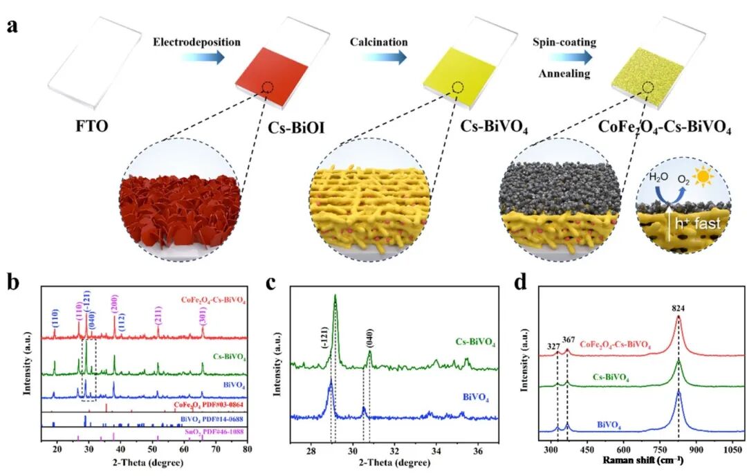 采用电沉积法和旋涂法合成了CoFe₂O₄-Cs-BiVO₄复合光阳极,并通过XRD和Raman光谱证实了Cs掺杂成功诱导BiVO₄晶格发生畸变,特别是促进了钒酸铋高活性(040)晶面的暴露。
