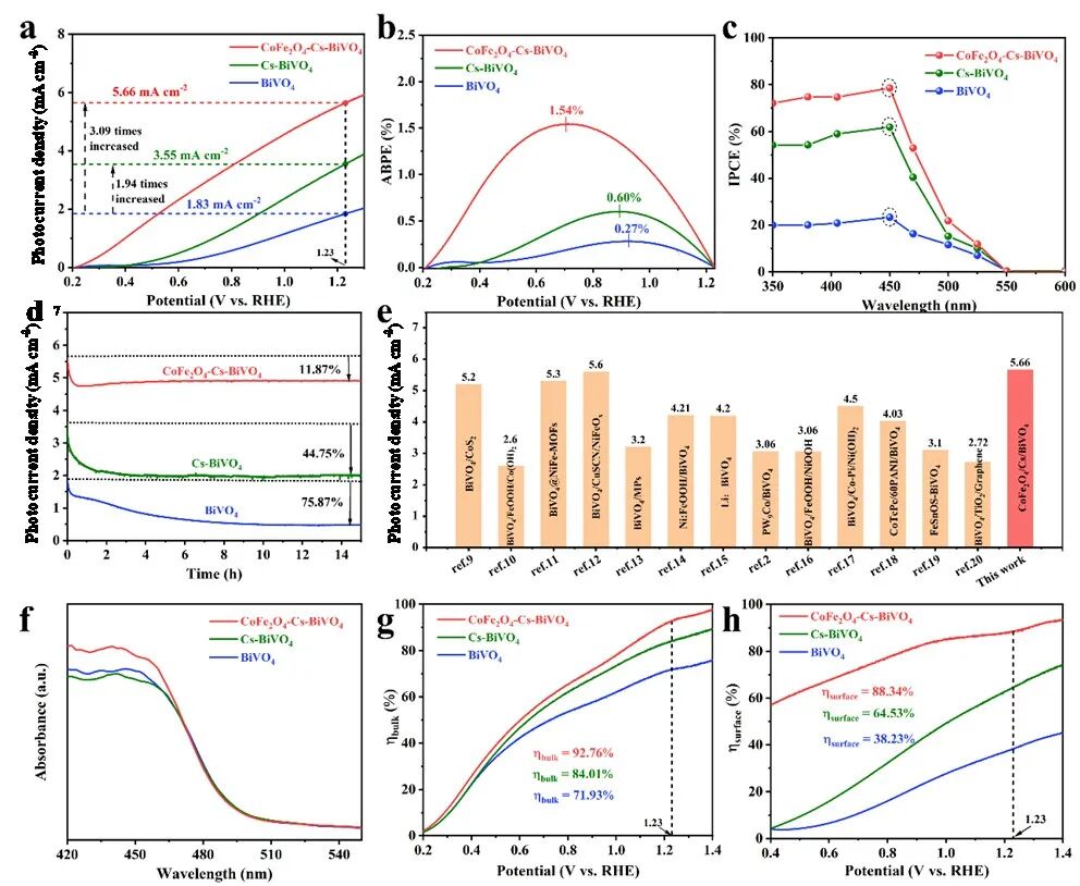 图3.(a)所有光阳极的线性扫描伏安曲线。(b)所有光阳极的ABPE曲线。(c)所有光阳极的IPCE曲线。(d)所有光阳极在1.23 V vs. RHE时的光电流密度与时间曲线。(e)CoFe₂O₄-Cs-BiVO₄光阳极与其他BiVO₄基光阳极的光电流比较。(f)所有光阳极的紫外-可见吸收光谱。(g)所有光阳极的体相电荷分离效率。(h)所有光阳极的表面电荷注入效率。