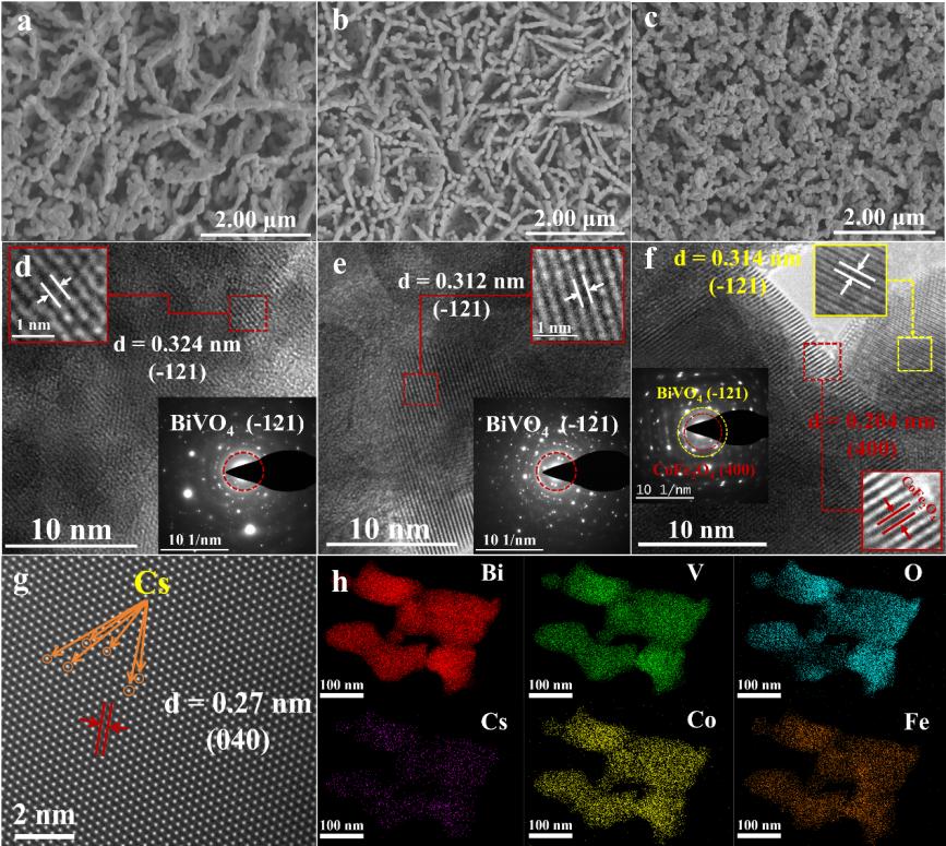 图2.(a)BiVO4、(b)Cs-BiVO₄和(c)CoFe₂O₄-Cs-BiVO₄的扫描电子显微镜图像。(d)BiVO₄、(e)Cs-BiVO₄和(f)CoFe₂O₄-Cs-BiVO₄的透射电子显微镜图像。在(d-f)中插图是相应的选区电子衍射图。(g)Cs-BiVO₄的球差透射电子显微镜图像。(h)CoFe₂O₄-Cs-BiVO₄光阳极的EDS元素映射图(Bi、V、O、Cs、Co和Fe)。