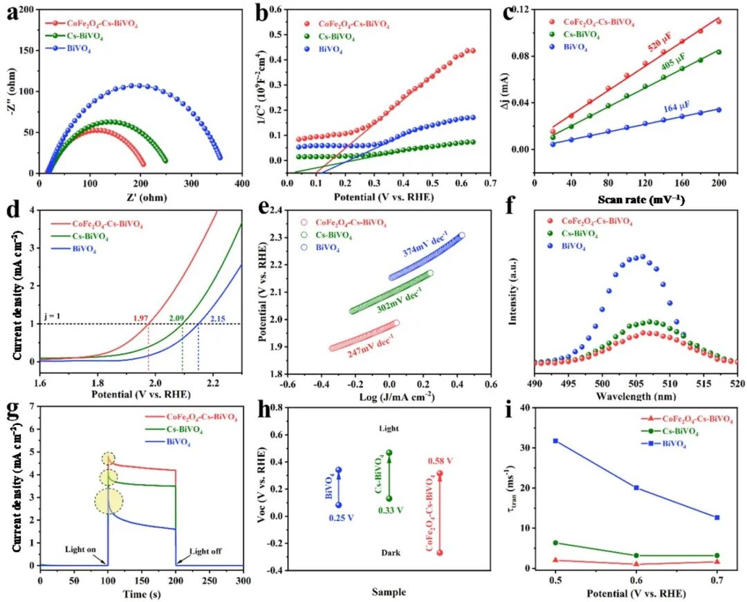 2. CoFe₂O₄空穴提取层加速界面传输:表面负载的CoFe₂O₄作为高效空穴提取层,一方面接收从BiVO₄体相迁移来的空穴,提供快速传输通道;另一方面其表面丰富活性位点为析氧反应(OER)提供场所,加速空穴与电解液中水分子反应。