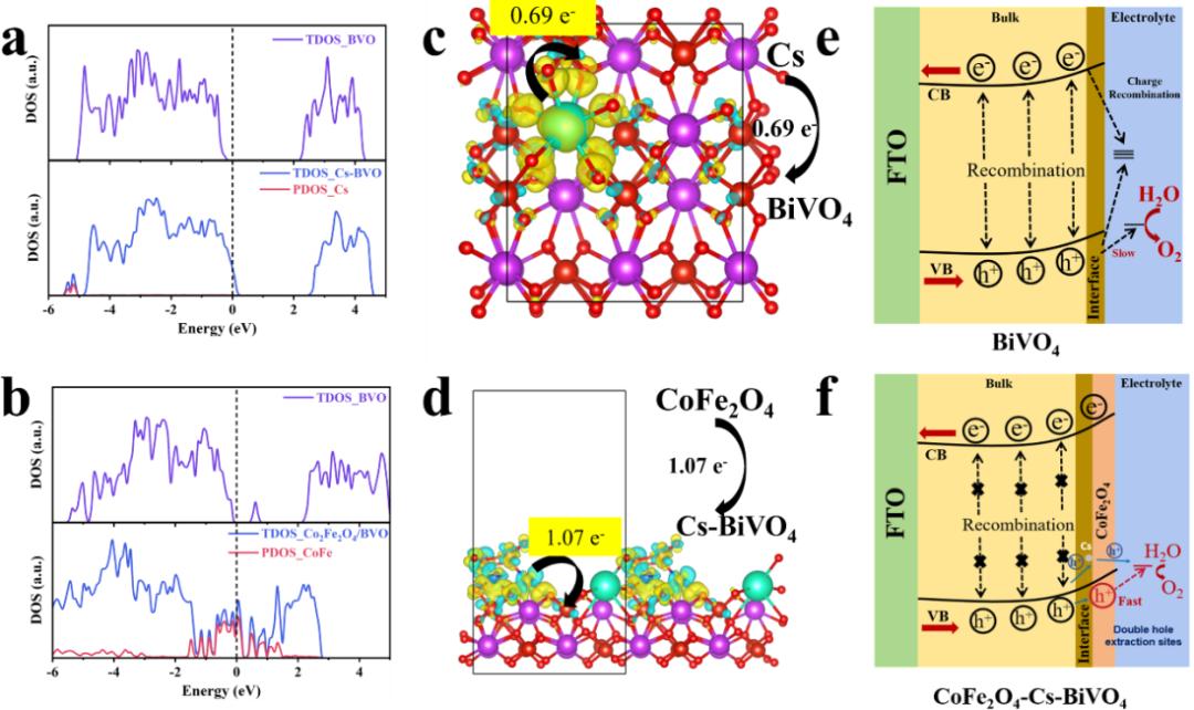 图5.(a)Cs-BiVO₄和(b)CoFe₂O₄-BiVO₄光阳极的DOS图。(c)Cs-BiVO₄和(d)CoFe₂O₄-Cs-BiVO₄光阳极的电荷密度差图。(e)BiVO₄和(f)CoFe₂O₄-Cs-BiVO₄光阳极的电荷转移过程示意图。