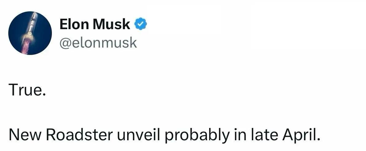 特斯拉创始人马斯克也进行发文宣布,将于4月下旬发布推出Roadster;