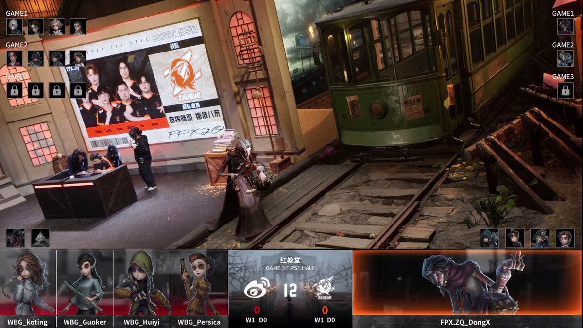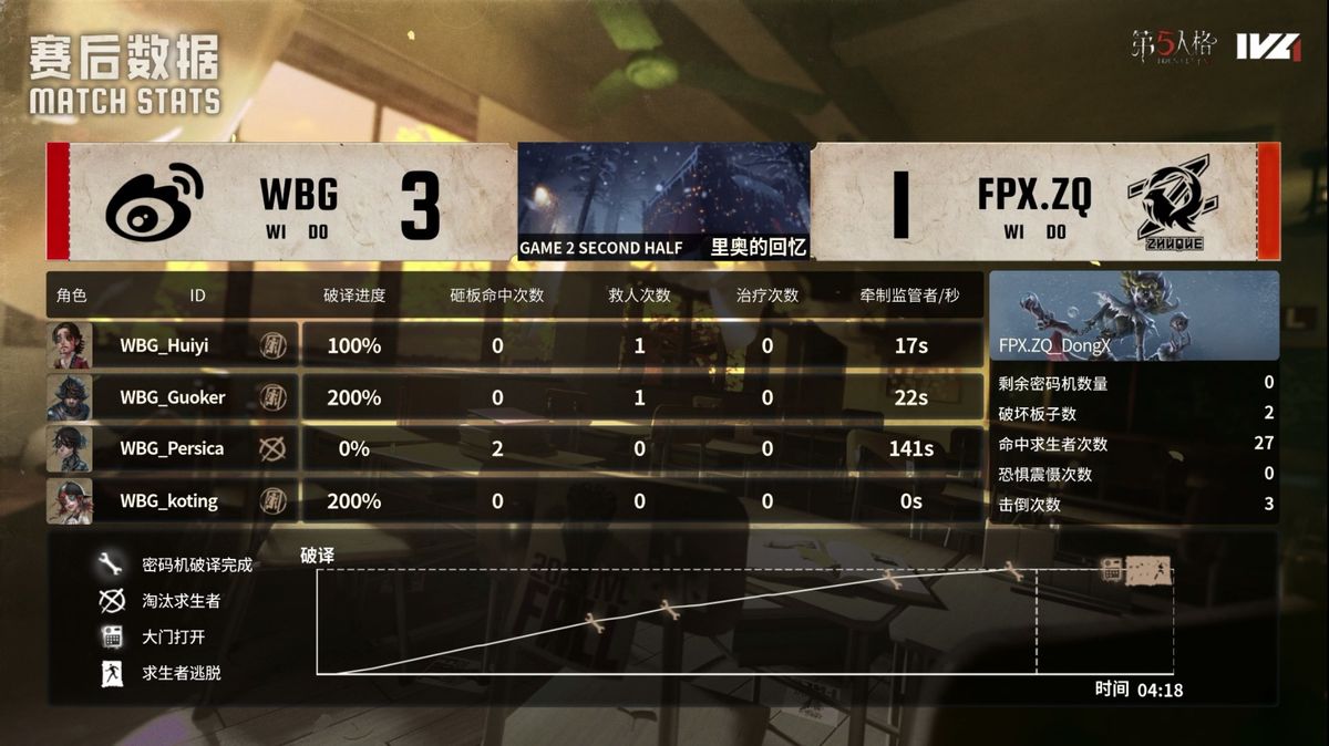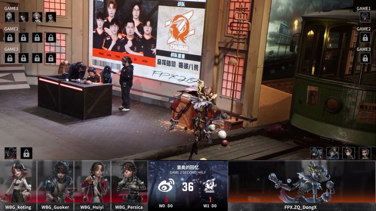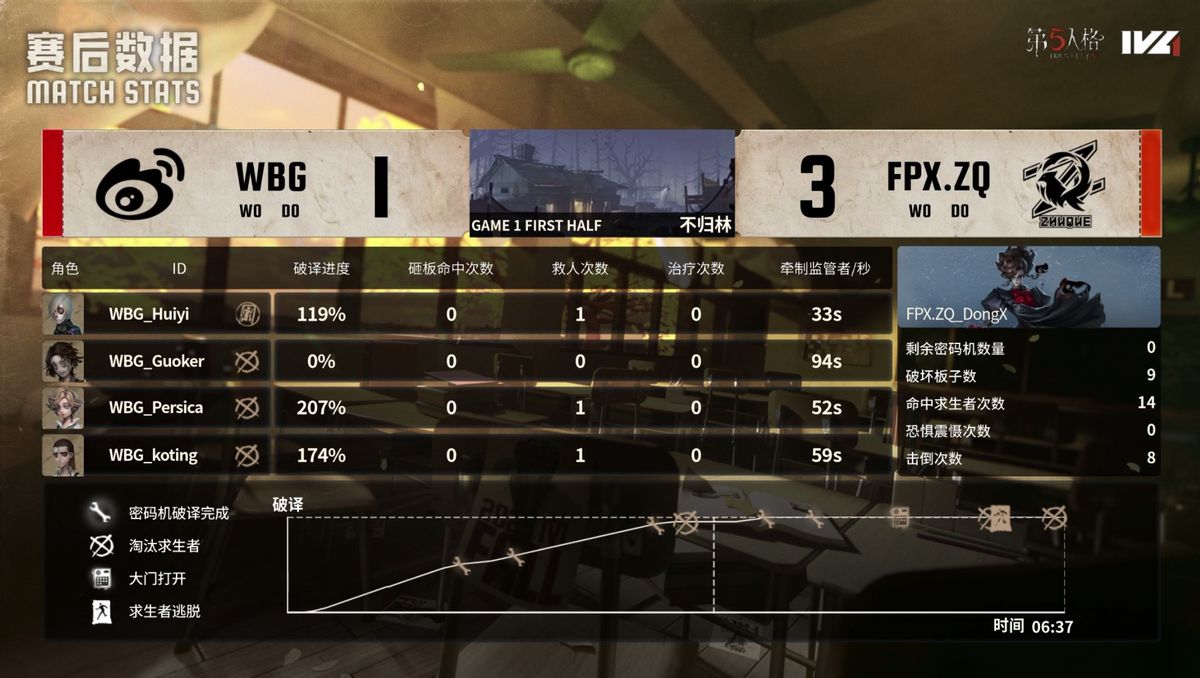 北京WBG的求生者选择了拉拉队员、飞行家、大副、“囚徒”(BAN“跛脚羊”);FPX.ZQ的监管者DongX选择了“喧嚣”。(BAN先知、火灾调查员、幸运儿、空军)