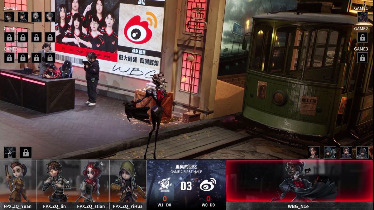 FPX.ZQ的求生者选择了气象学家、教授、古董商、大副(BAN时空之影、“喧嚣”);北京WBG的监管者N1e选择了邦邦。(BAN先知、冒险家、幸运儿、火灾调查员)