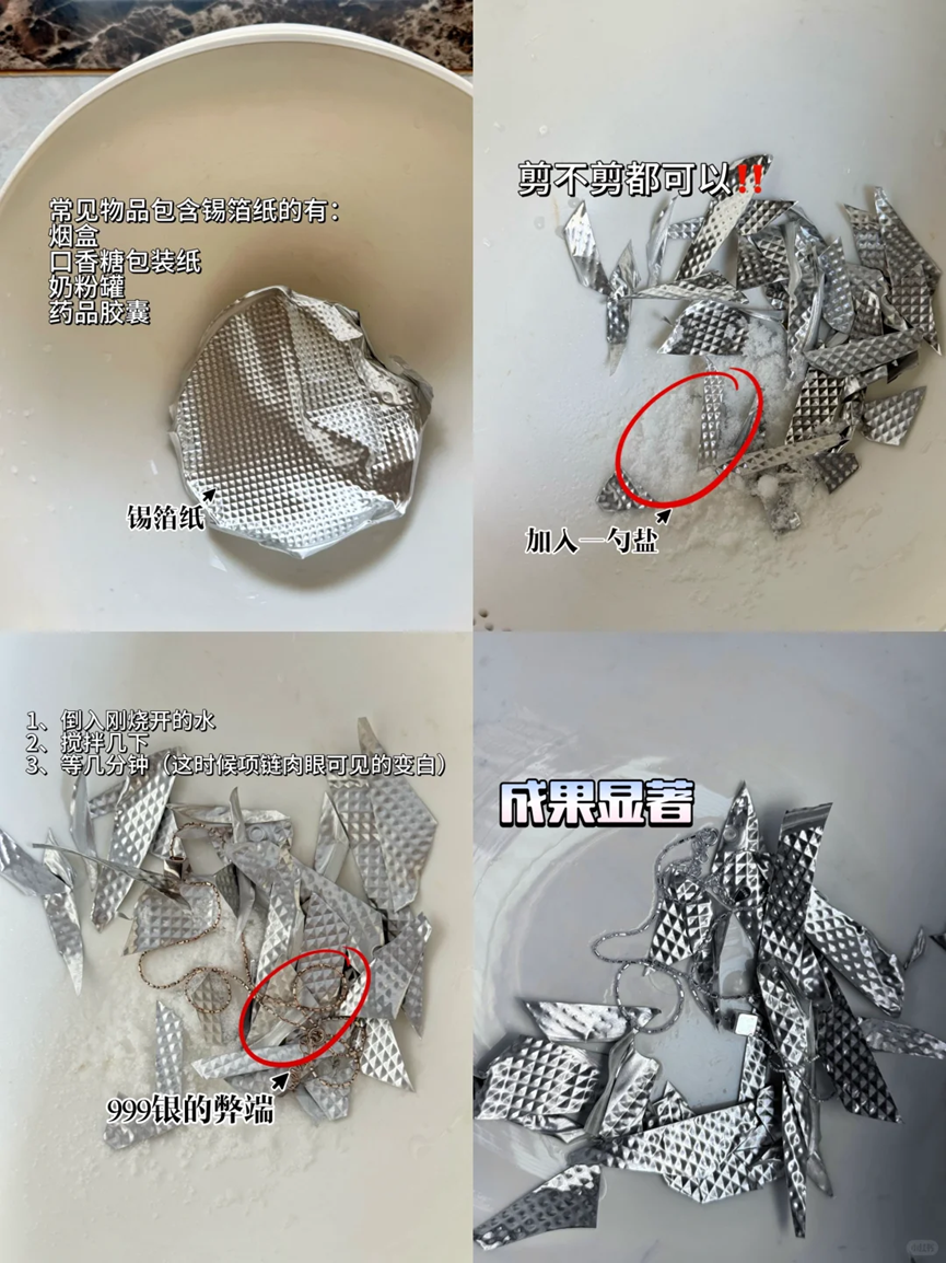 有的人会选择特意花钱去购买银饰清洁剂,但其实根本就没有这个必要,只需要使用普普通通的锡纸就能够将银饰清洁干净了。