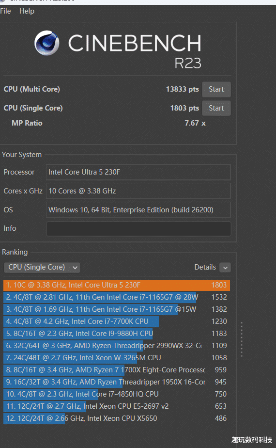 r23分数达到了1803分,这个数据再230f上其实表现很不错了;