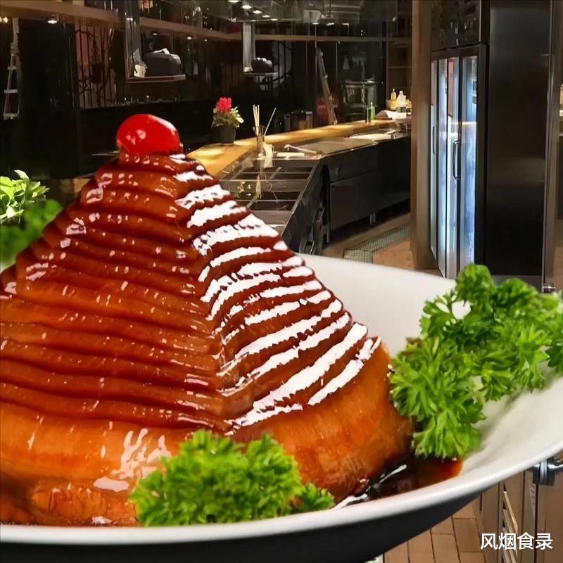 这肉讲究刀工如绣,需将五花肉切出薄而不断的连刀片,卷回塔形蒸透,浇上金酱后色泽油亮如琥珀,入口即化不腻,梅干菜香渗肉间,咸鲜回甘。