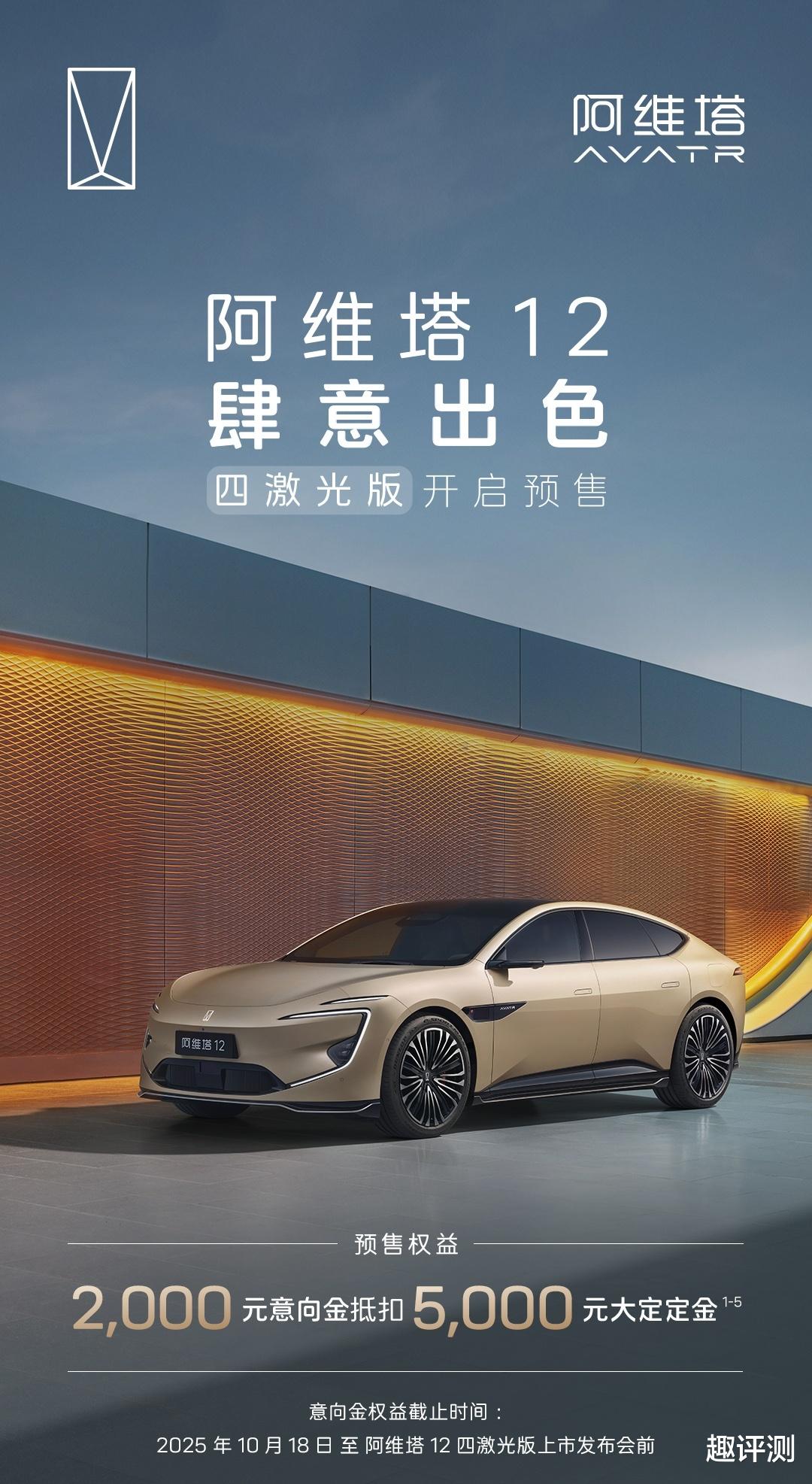 2025年10月18日(重庆),阿维塔12 四激光版预售发布会在重庆旁观者设计博物馆举办,并宣布阿维塔*华为乾崑智驾®城市公开赛即将启动。阿维塔12 四激光版提供纯电与增程双动力,共推出6款车型。即日起至上市前下订,即可享2000元意向金抵扣5000元购车款的限时预售权益。