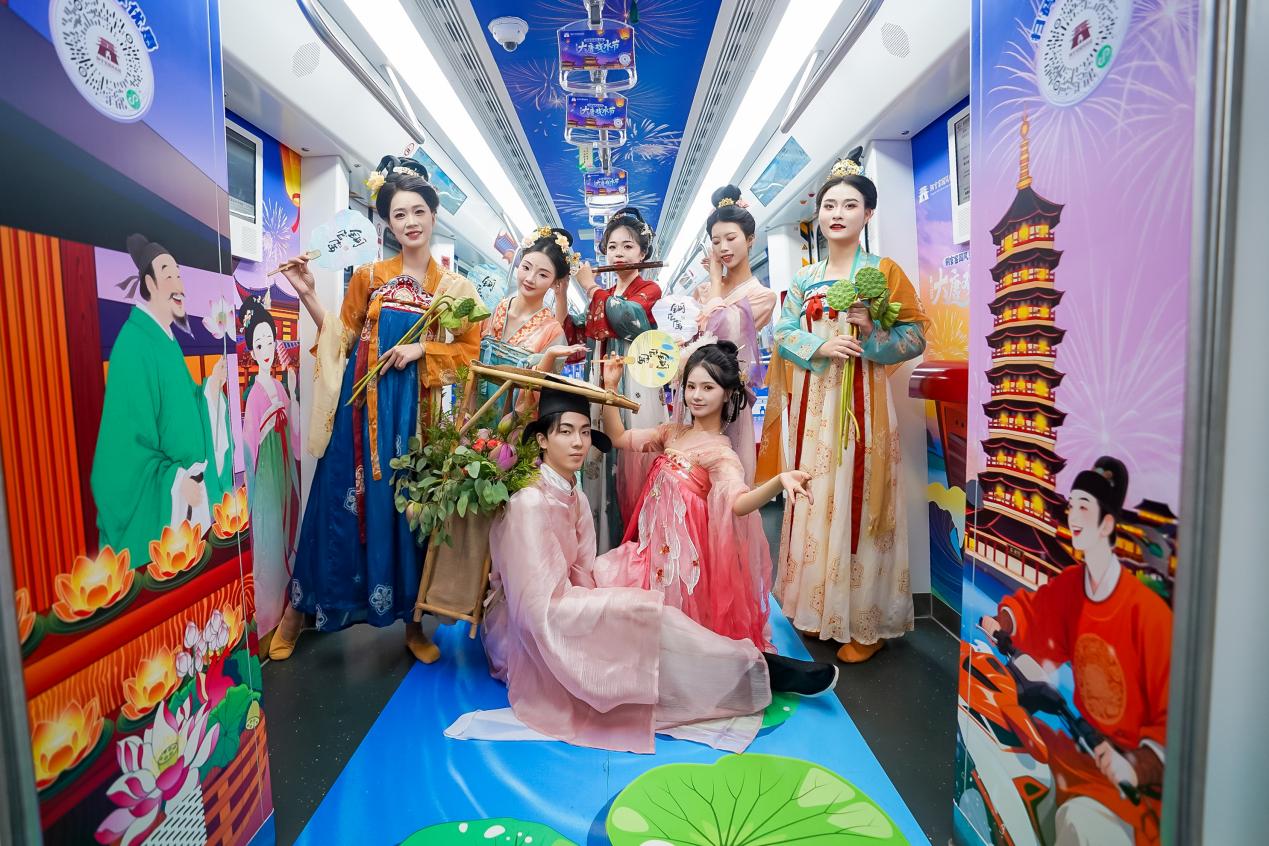 7月31日,一场跨越千年的沉浸式唐风快闪与互动巡游在长沙地铁2号线铜官窑主题列车上与五一广场地铁站厅内热烈上演。繁忙的城市轨道交通化身为穿越时空的隧道,大唐盛景顷刻便浮现在眼前。