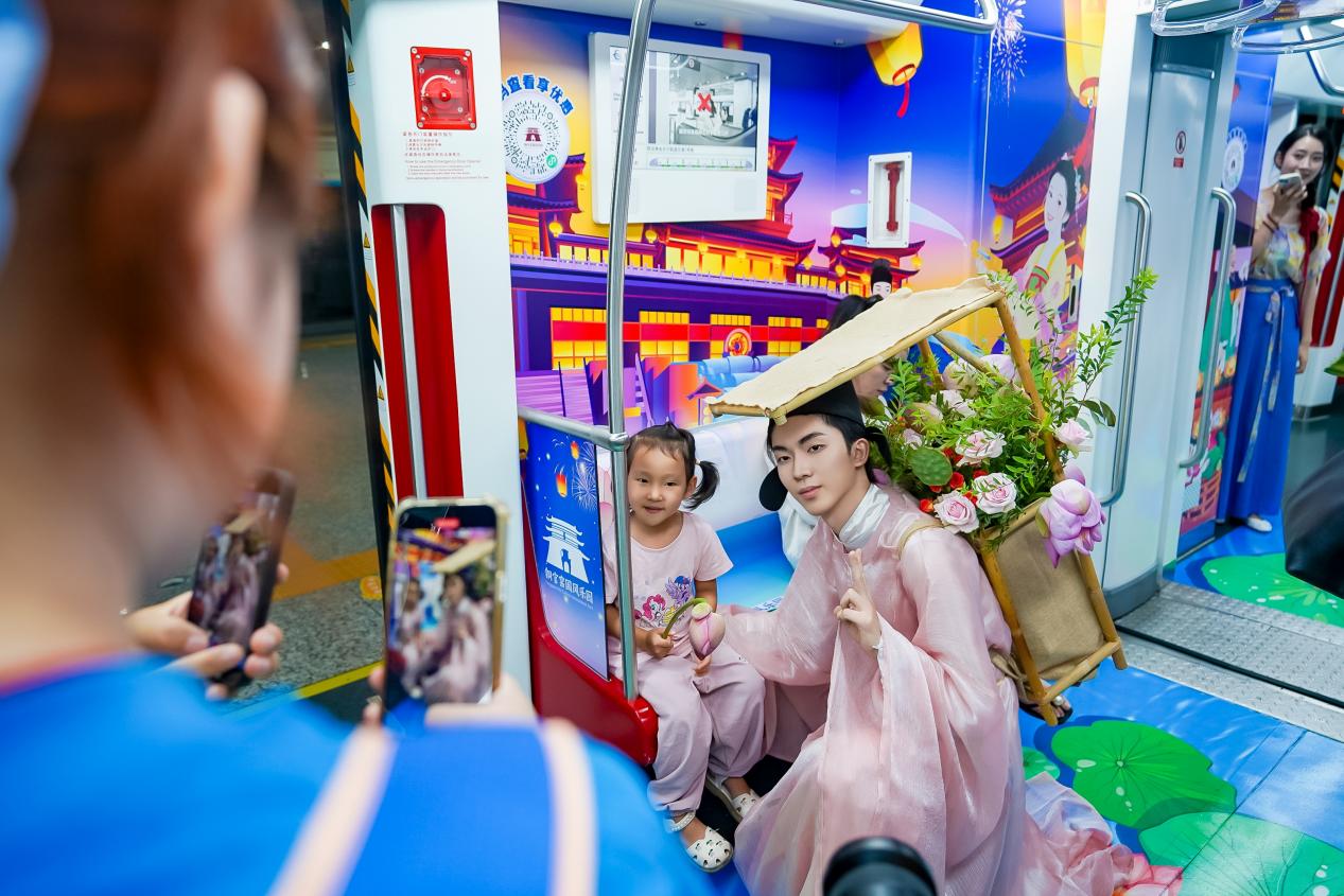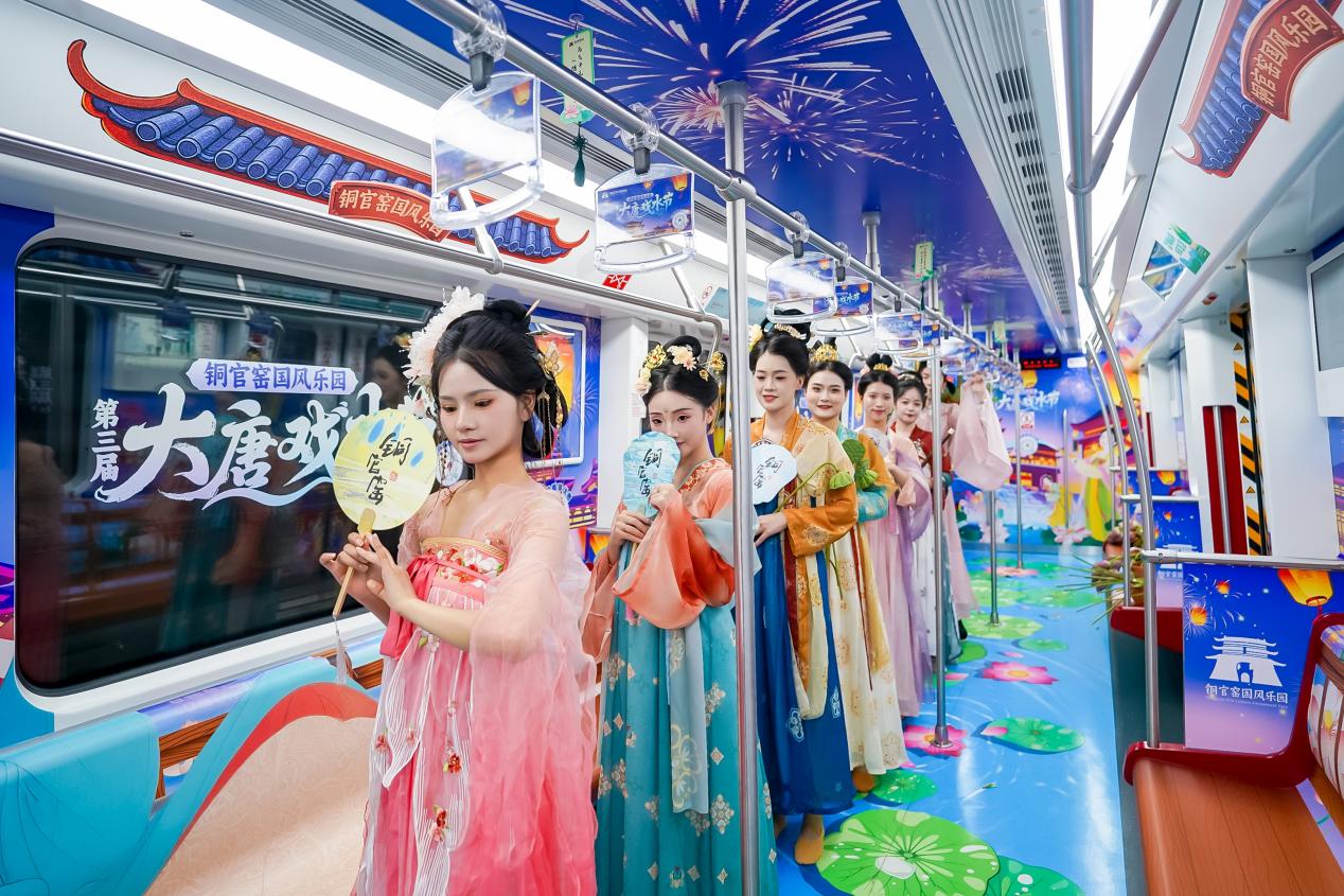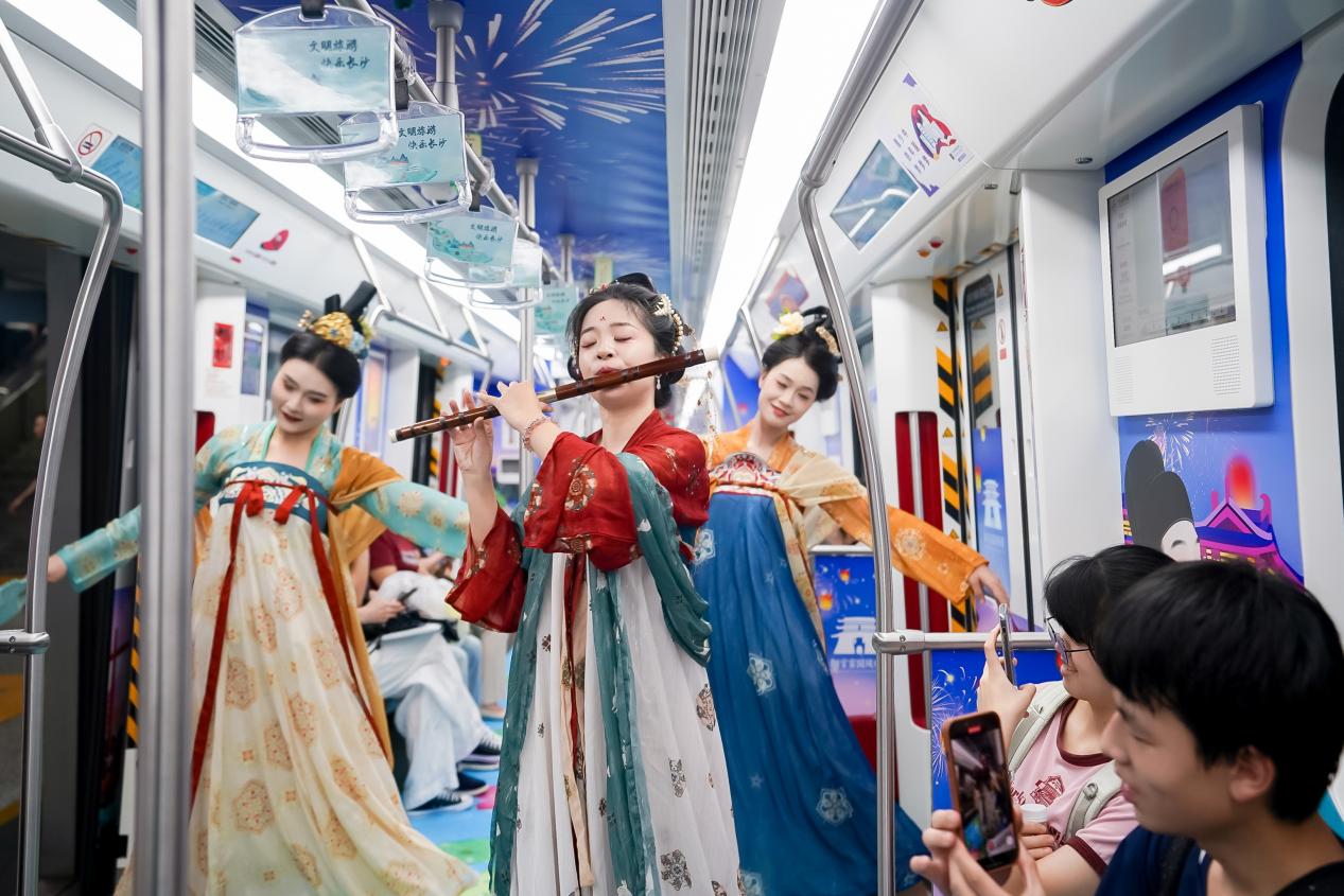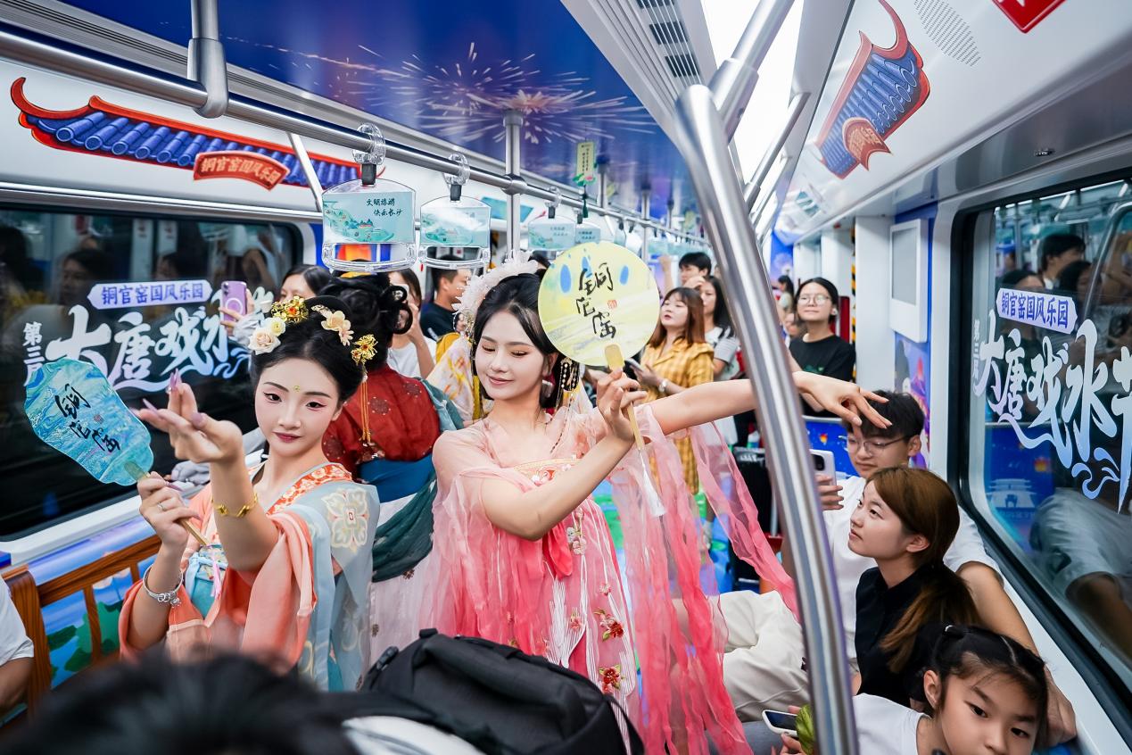 车厢内,手机镜头纷纷举起,在笑声与掌声交织的欢乐海洋中,欣欣向荣的盛唐气象循序展开,在钢筋铁骨铸成的城市脉络中重焕新生。这场沉浸式的快闪巡游不仅定格了无数市民乘客参与互动、自发传播的美好瞬间,更让铜官窑国风乐园“大唐气象”的品牌印记深植人心。