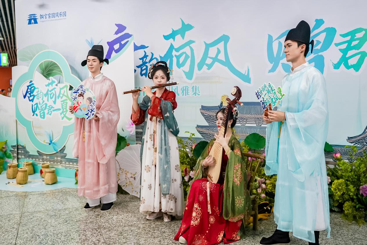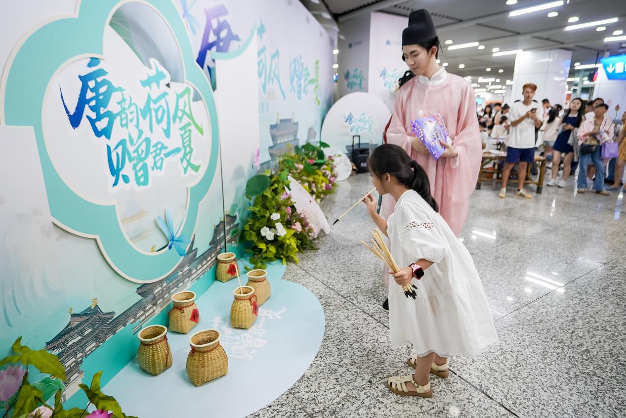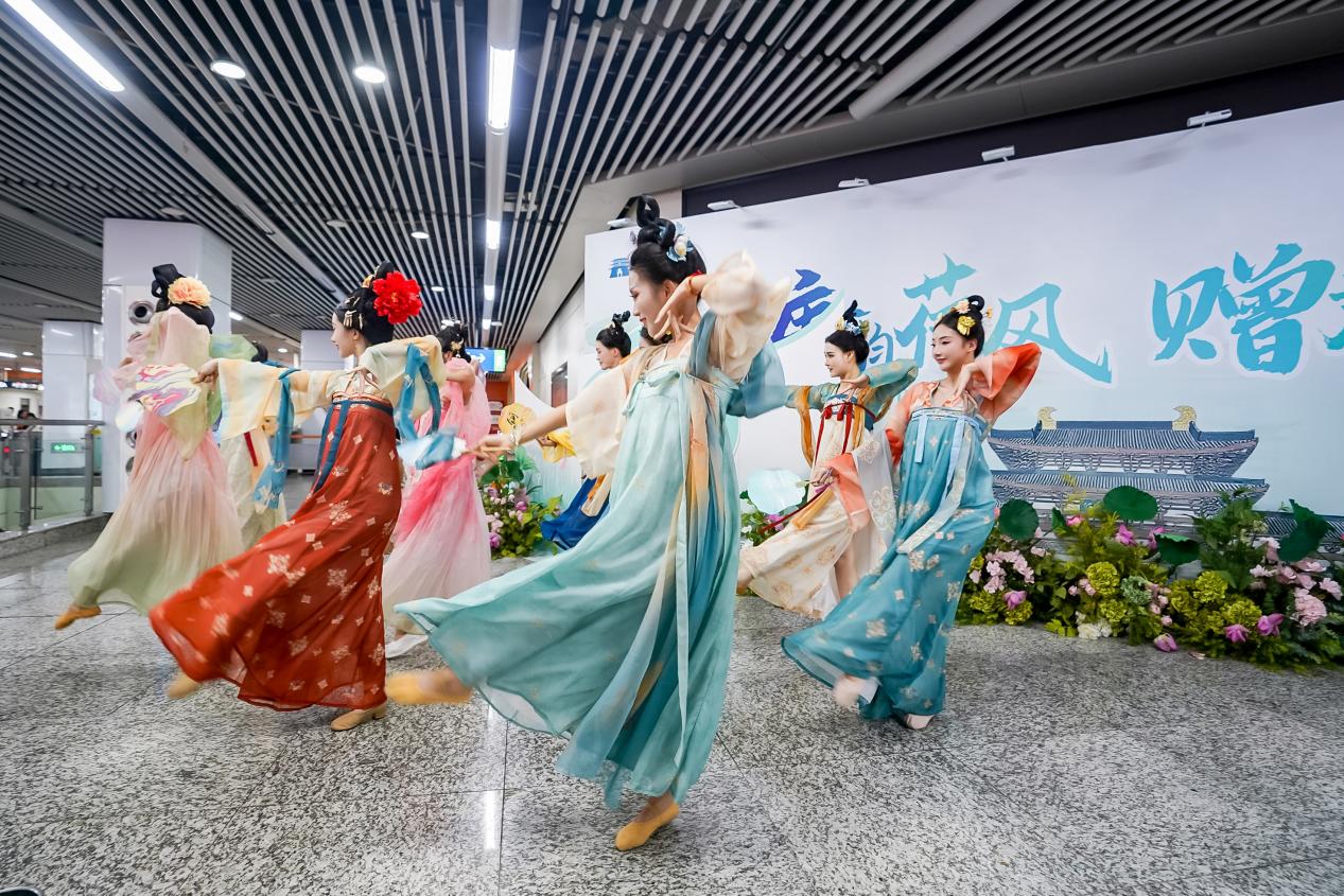 午后,长沙地铁1/2号线五一广场站6、7号口一举变身为大唐文化互动乐园,“唐韵荷风·赠君一夏”主题站厅活动正式开启。随着明快的鼓点响起,数名舞者于巨幅唐风包柱前翩然起舞,胡旋急转、踏歌欢腾,引得行人纷纷驻足流连。舞毕,舞者们携带着莲花与铜官窑周边文创在地铁站内巡游、随机派发礼品,与市民游客合影互动。