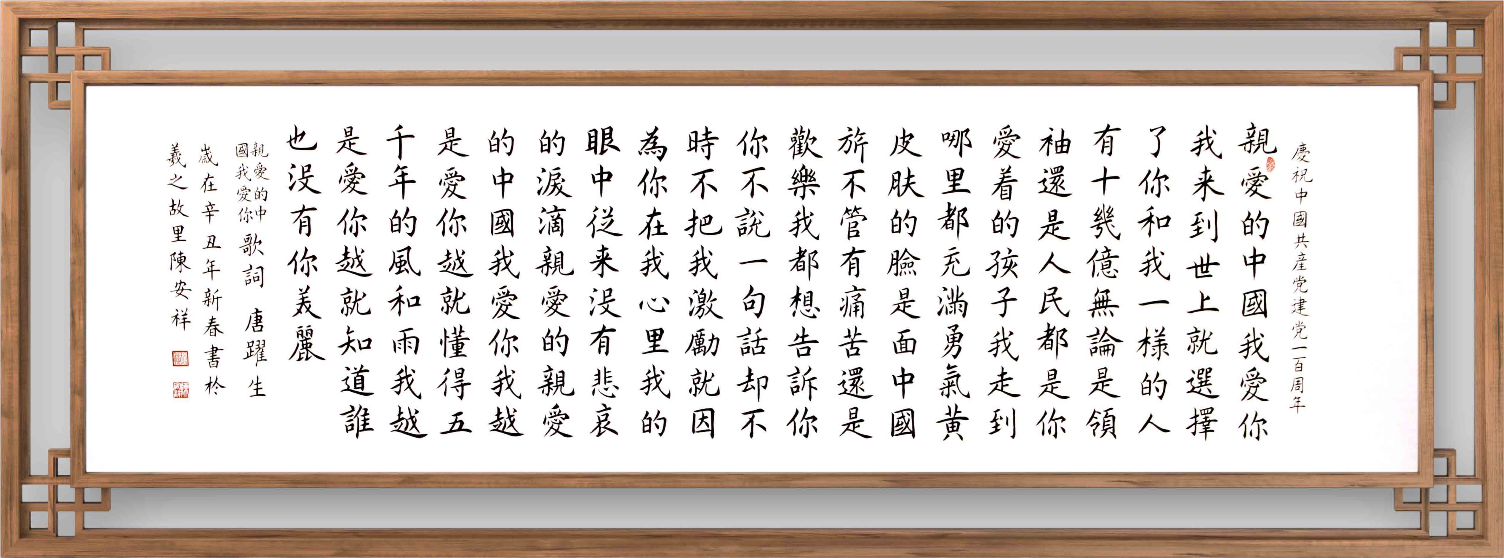陈安祥,山东临沂人,一九五零年生,国家特级书法师,法兰西皇家美术学院荣誉博士,现任阿里巴巴国际书画研究院名誉院长、中国书画艺术促进会理事、中国国际书画艺术研究院院士、中国国际艺术家协会高级书法师、艺术顾问。书法专攻欧、额及二王诸帖,尤擅长楷书。作品入编《中国诗书画国际交流大典》《中国当代实用书法大观》《世界当代艺术名家大典》及多部权威大典。作品多次获奖,如纪念抗战胜利七十周年书画展金奖、神舟十一载人航天飞行成功书法精品展金奖、纪念改革开放四十周年全国书画大赛金奖、首届兰亭羲之奖艺术邀请展金奖、新长城文化金奖、国庆七十周年书法艺术展金奖等。并在国外多次巡回展出。二零一八年被评为“国宾礼特供书法艺术家”,作品被紫光阁国礼中心收藏。当年再次入选法国卢浮宫中国书画名家精品展,荣获特别成就奖及最高荣誉勋章,作品被法国卢浮宫博物馆永久收藏。二零一九年十一月被授予“共和国七十年杰出十大艺术功勋人物”荣誉称号。二零二零年八月《陈安祥书法艺术之路》课题已纳入中国管理科学研究院区域改革发展研究所经济研究中心最新科研成果,并荣获科研项目二等奖。二零二零年十一月聘任为中华卫视艺术风采栏目艺术总监。二零二零年十二月聘任为中国世纪大采风书画院常务副院长二零二一年三月被授予“二零二零年度国际中国艺坛领航人物”荣誉称号。二零二一年七月被授予“当代艺坛优秀典范人物”荣誉称号。二零二一年十月被授予“笔尖下的中国时代楷模”荣誉称号。