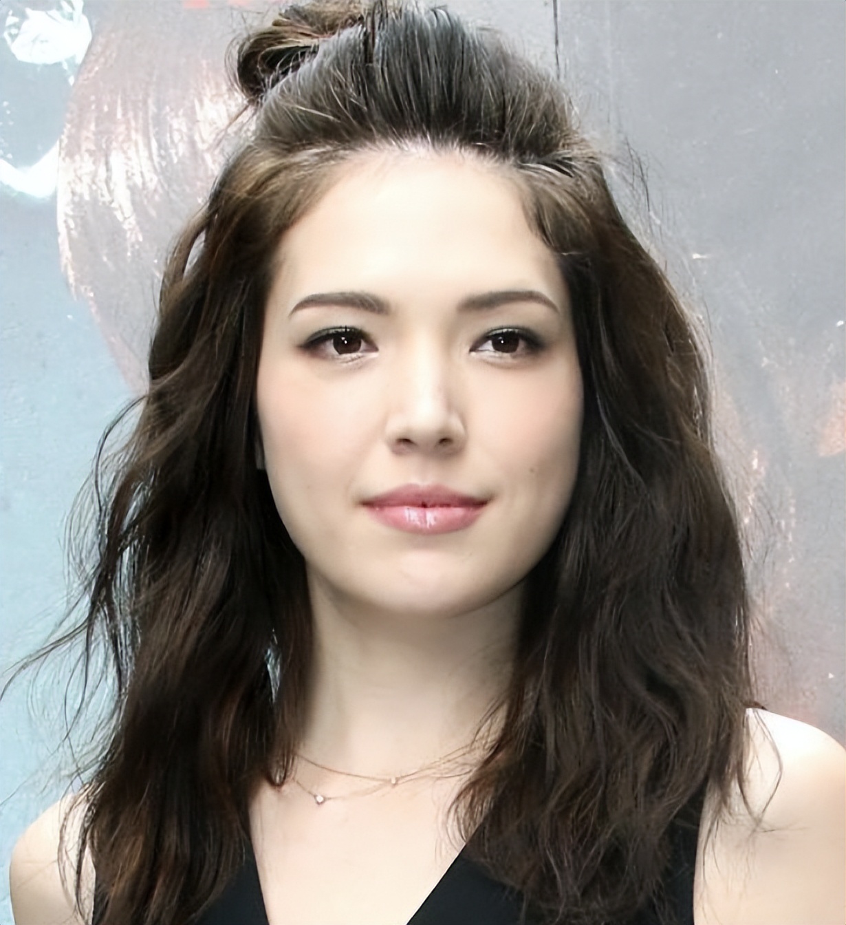 背景是某次时尚派对的金色气球墙。