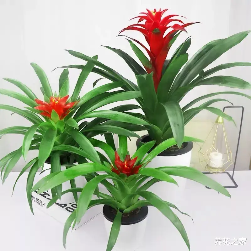 鸿运当头开出的红色花朵十分喜庆,是非常畅销的年宵花卉。它属于凤梨科的植物,凤梨科植物还有一个别名叫水塔花,这类植物都非常喜水。鸿运当头在冬天,很容易因空气干燥而枯叶黄叶,我们要注意给它补水。
