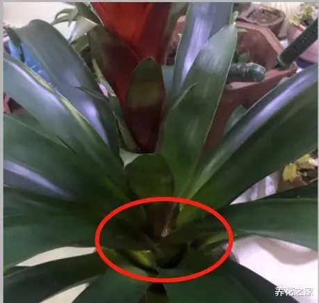 鸿运当头的浇水方式与普通花卉不同,它的中心部分有一个叶杯(上图红圈部分)。我们除了要保持土壤湿润外,还要“当头浇水”。把一定量的水浇在它的叶杯中心,使叶从中心有蓄积的水分,这样它的叶片可从水中吸收水分,保持湿润。