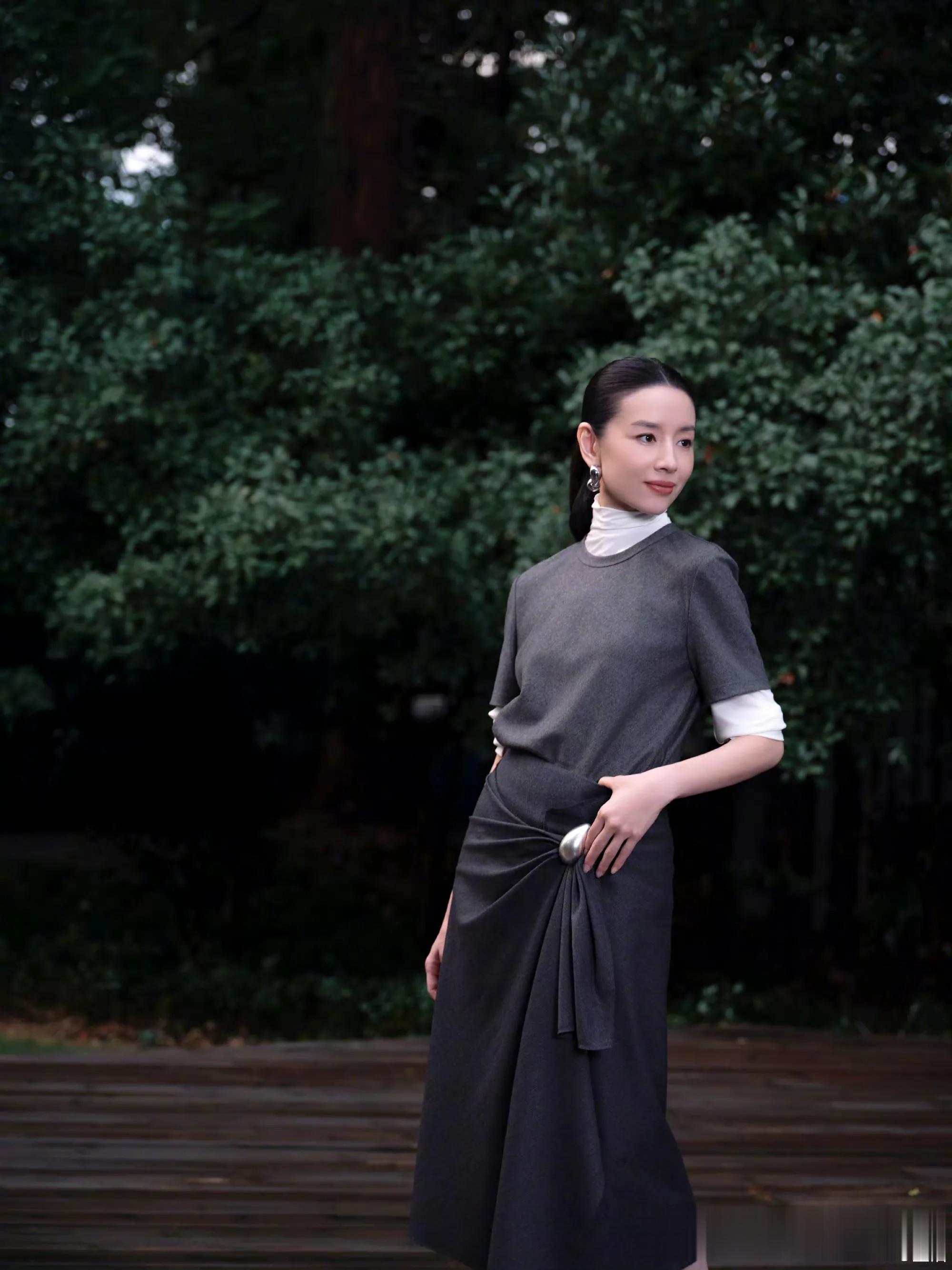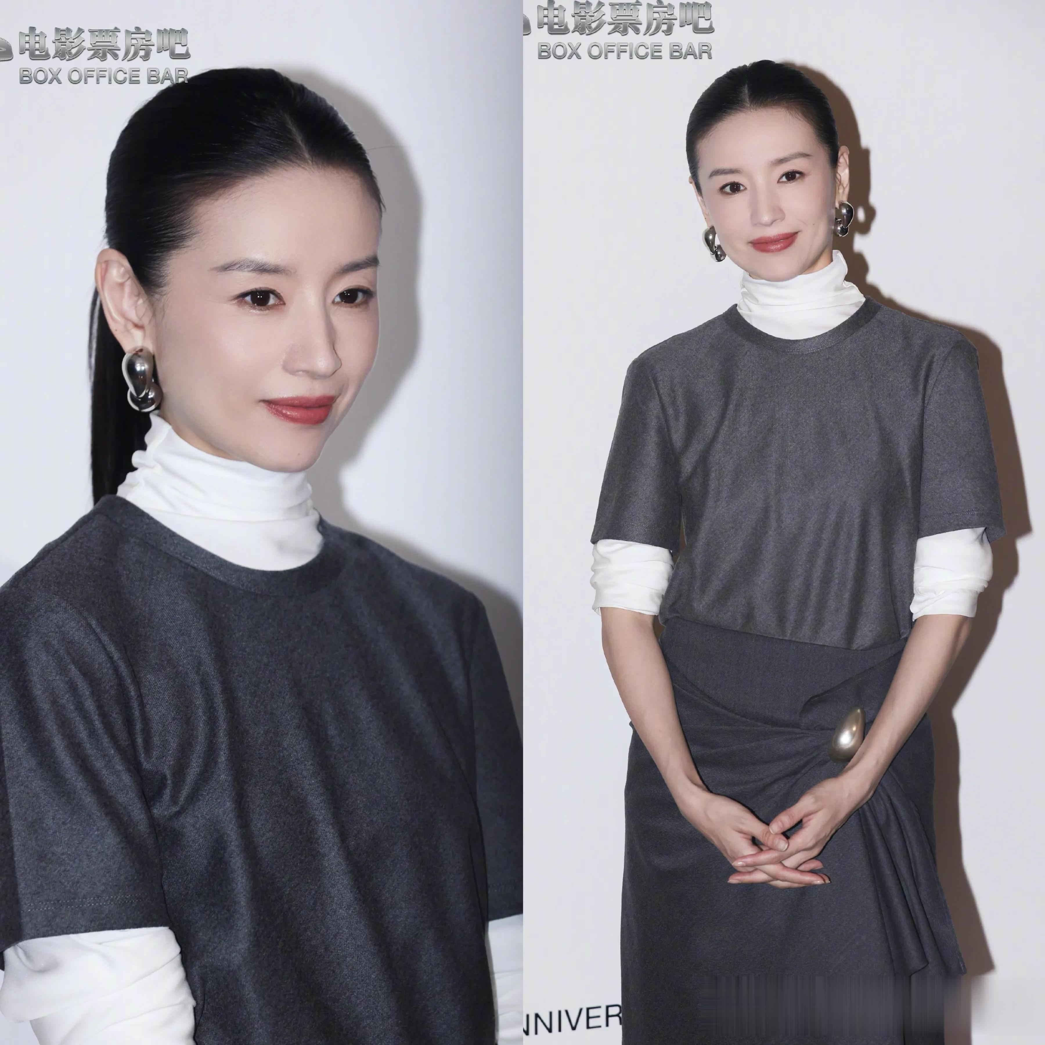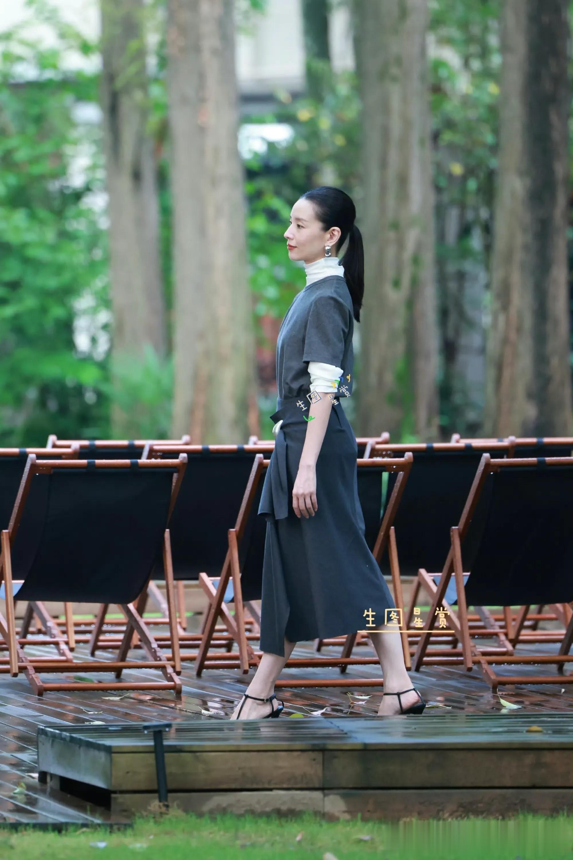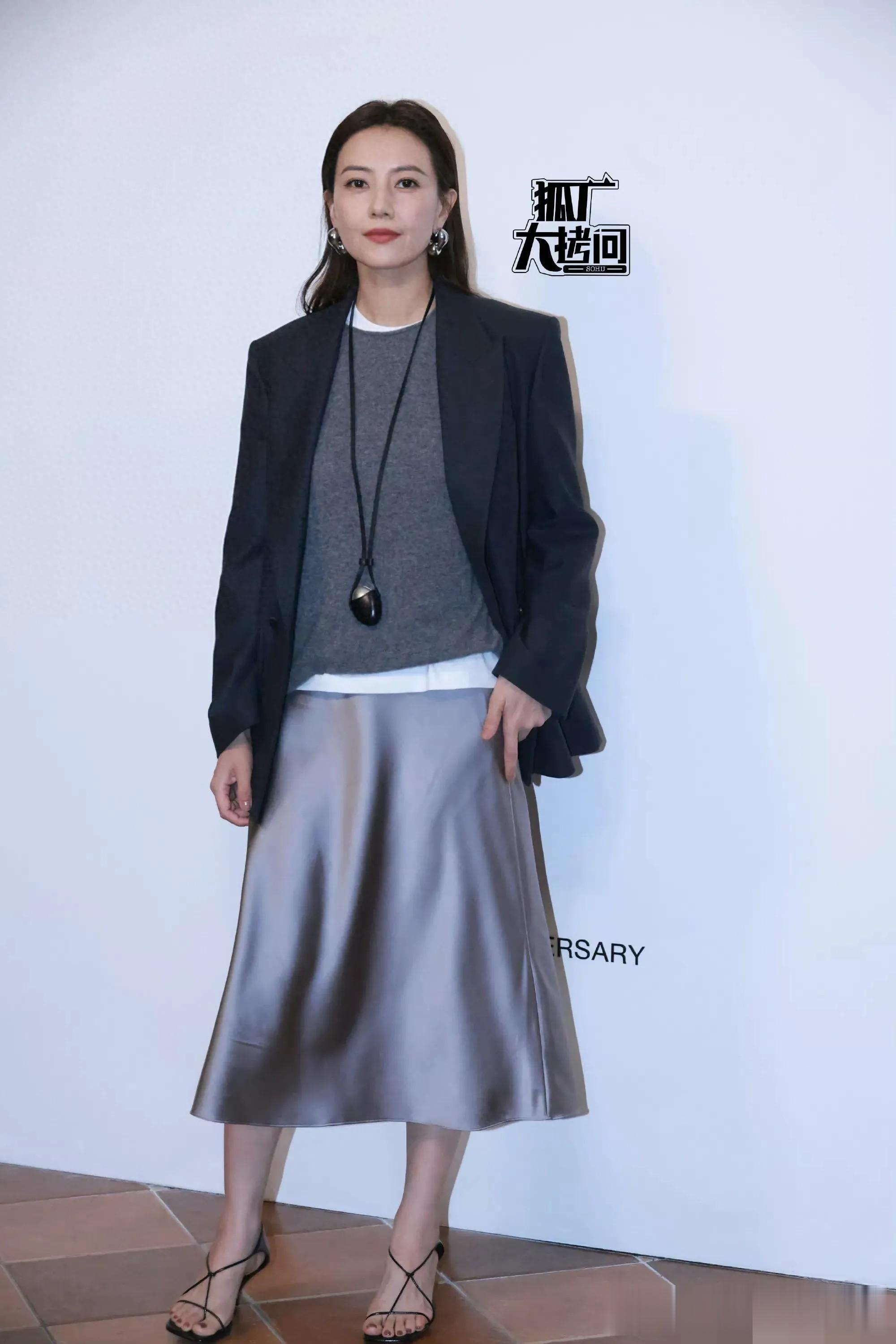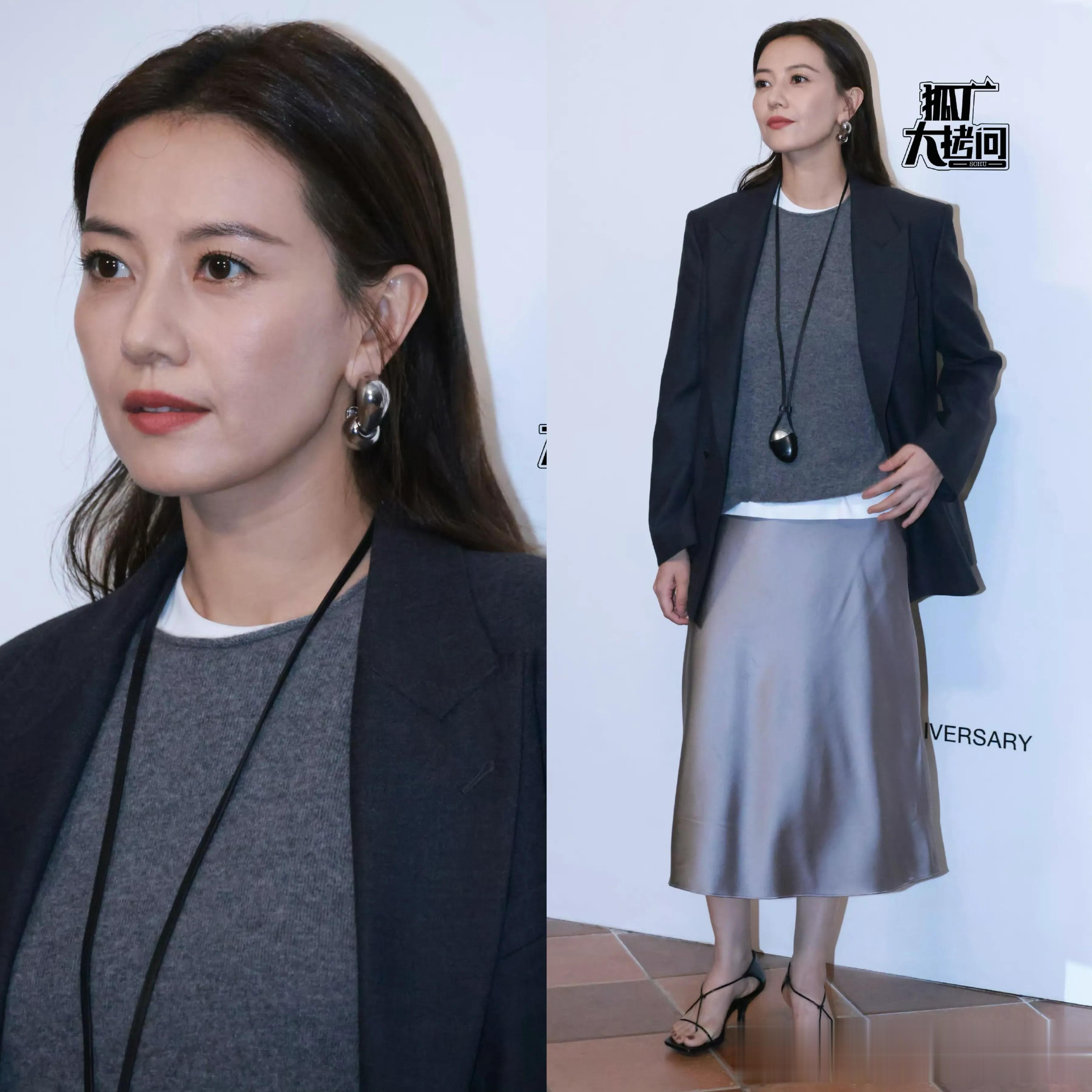 同样是灰色系的造型,董洁这套相对要繁复些,但是搭配她清爽的发型和她本身偏清冷的气质,看上去相当知性优雅。