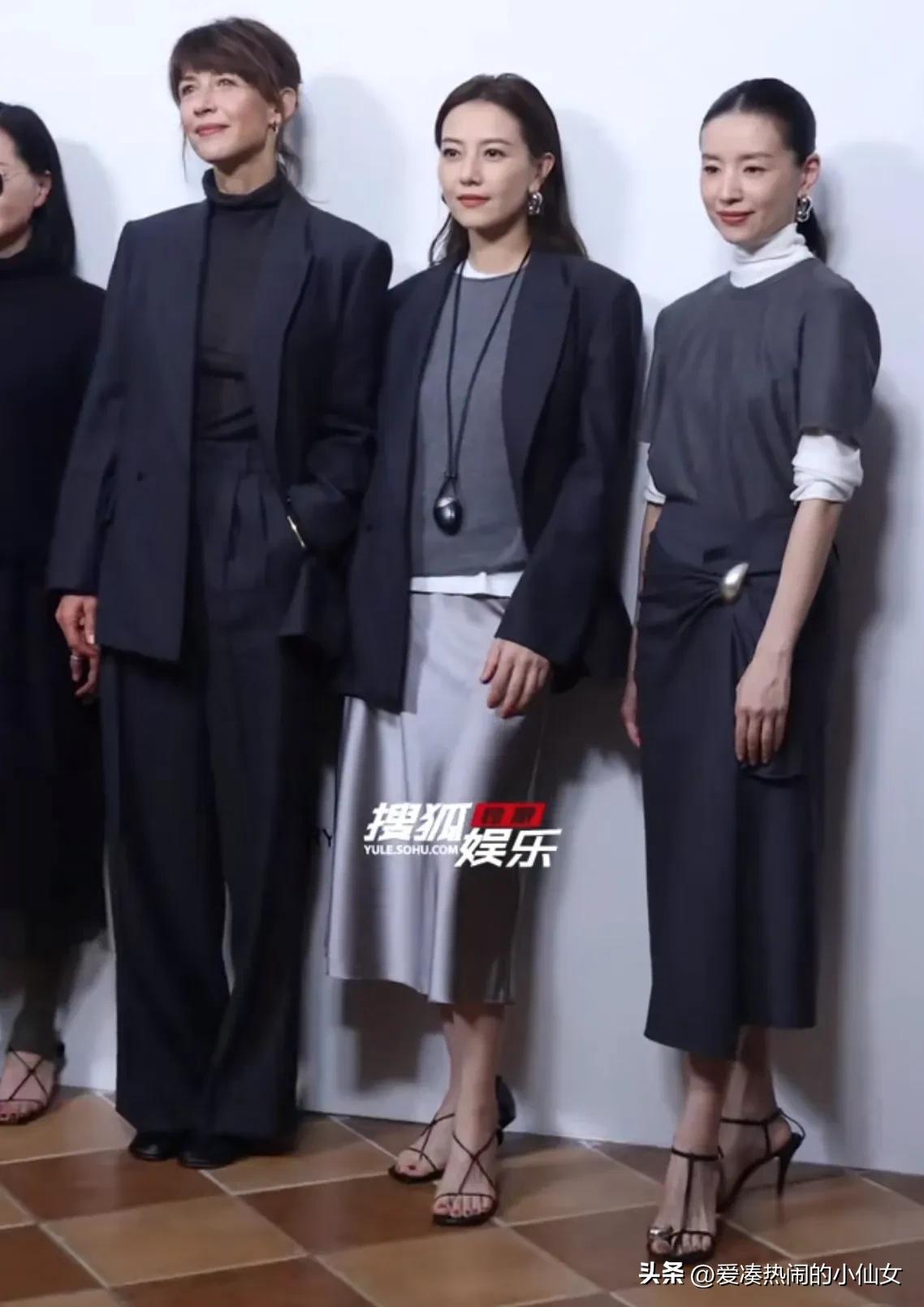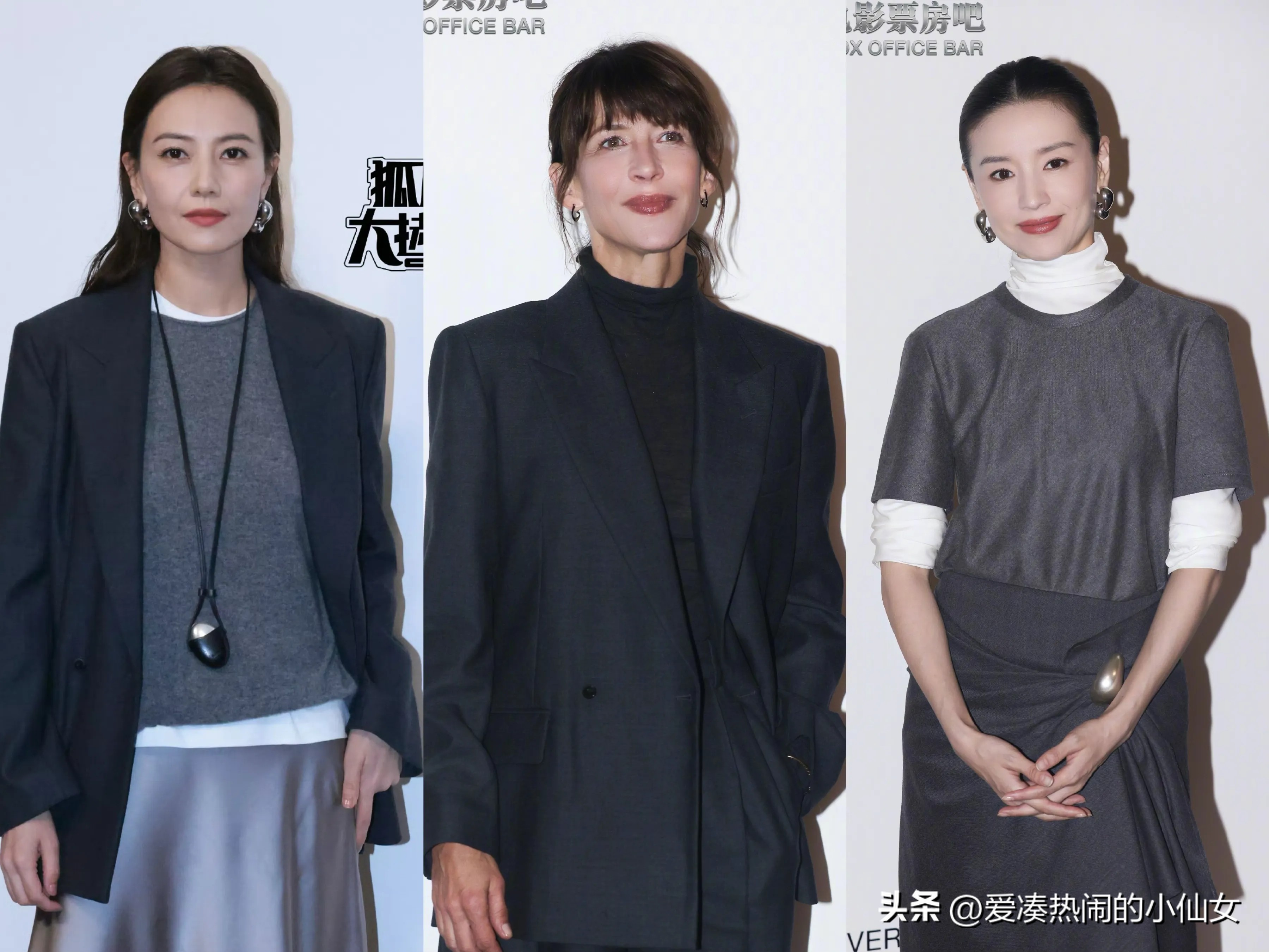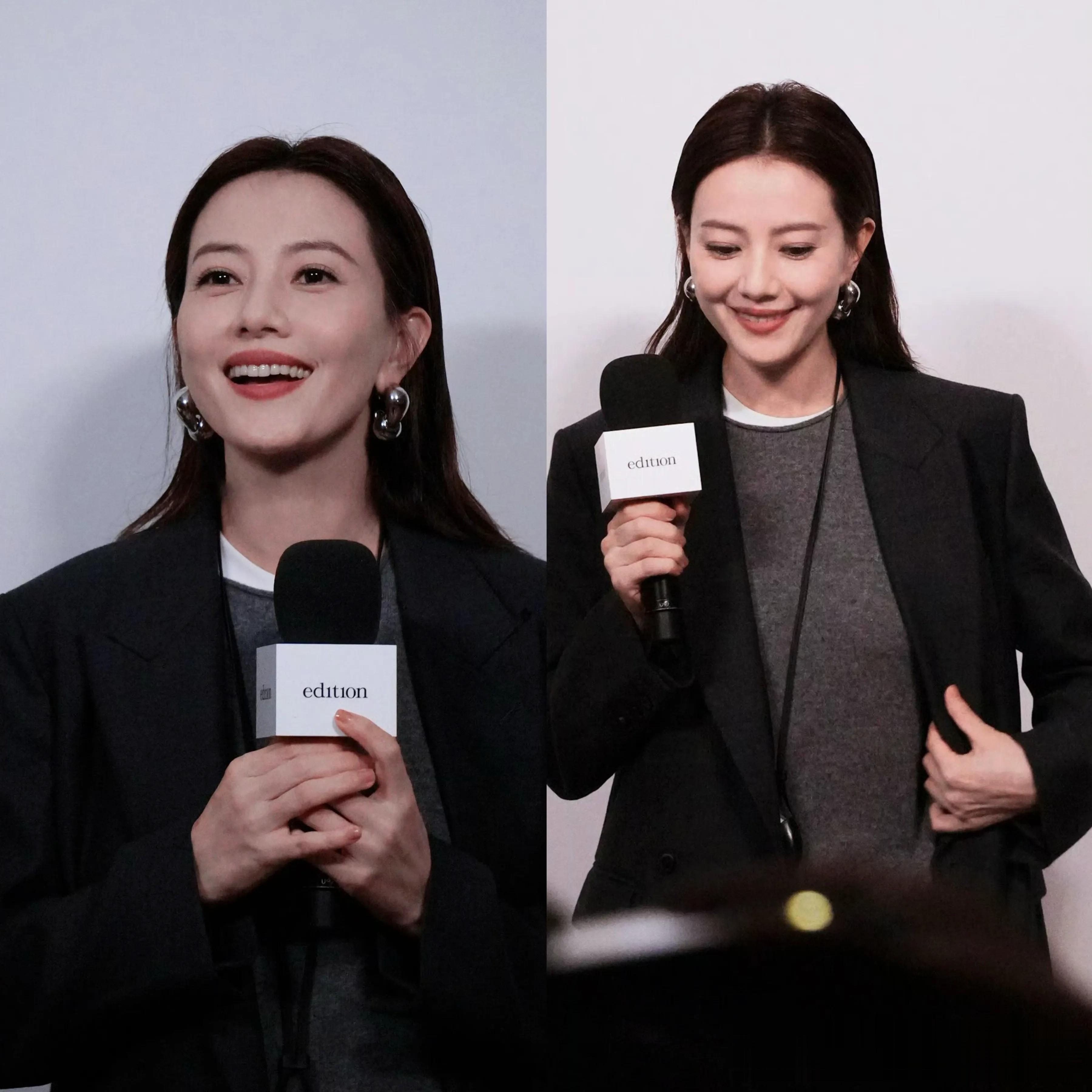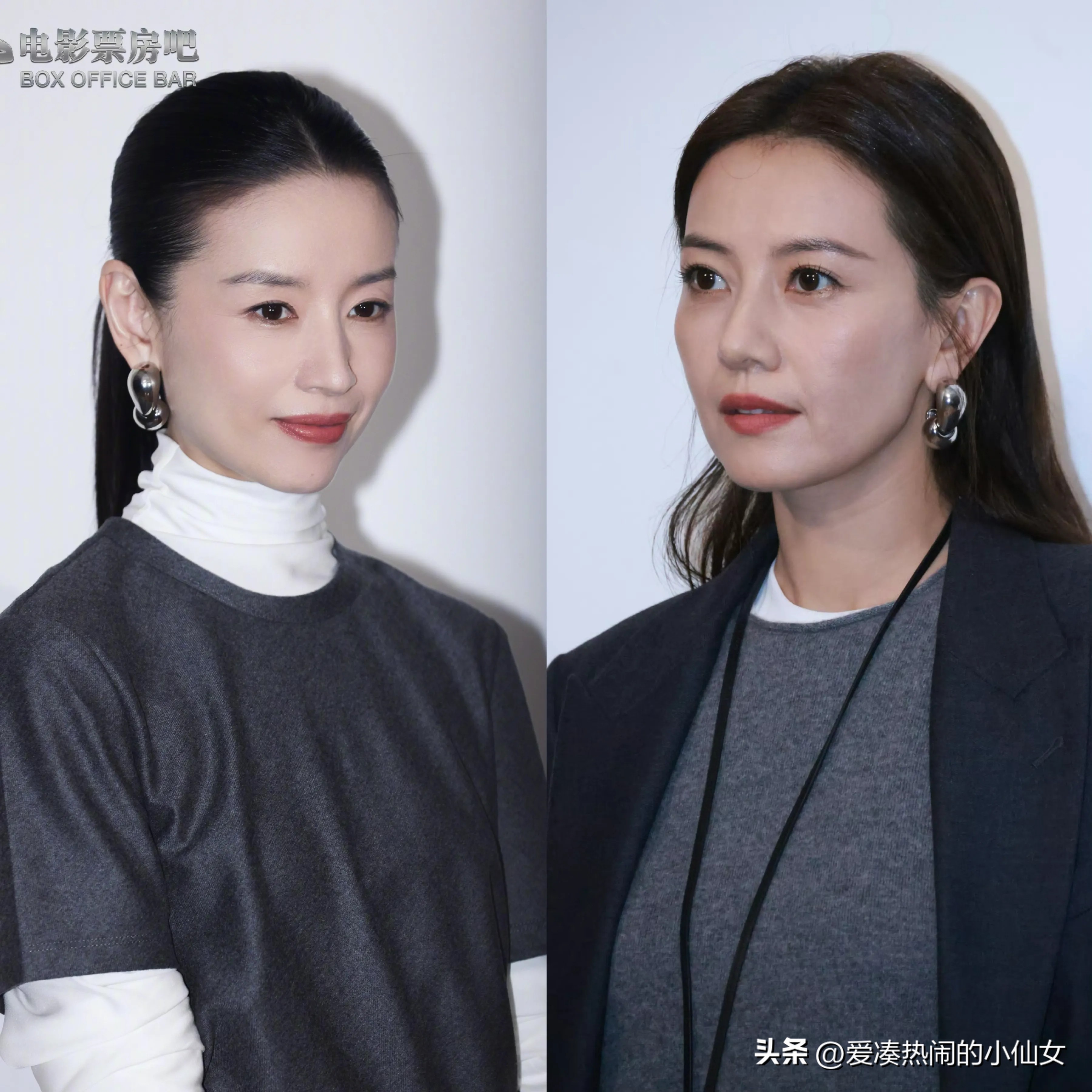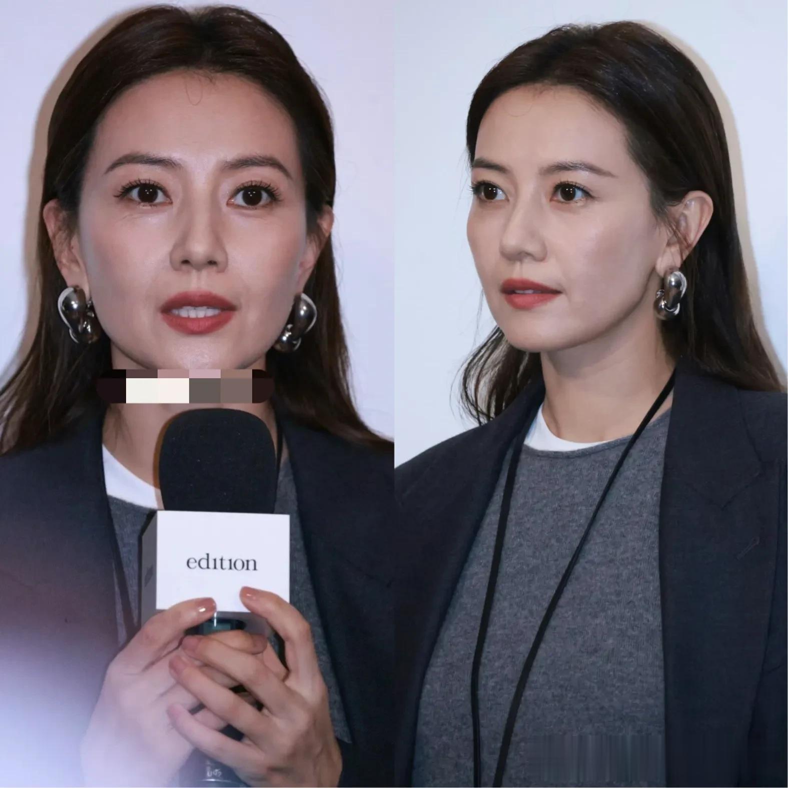 同样是灰色系的造型,董洁这套相对要繁复些,但是搭配她清爽的发型和她本身偏清冷的气质,看上去相当知性优雅。
