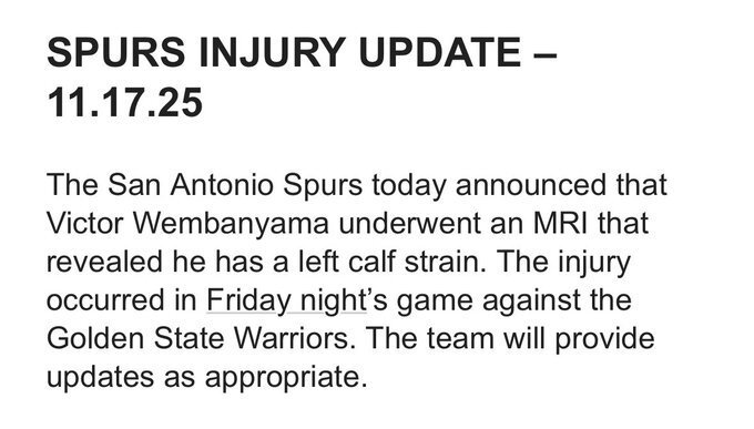 北京时间11月18日,NBA常规赛继续进行。在今天早些时候,据名记Shams和马刺队官方报道称,马刺队球星文班亚马遭遇左小腿拉伤,预计将缺席数周比赛。