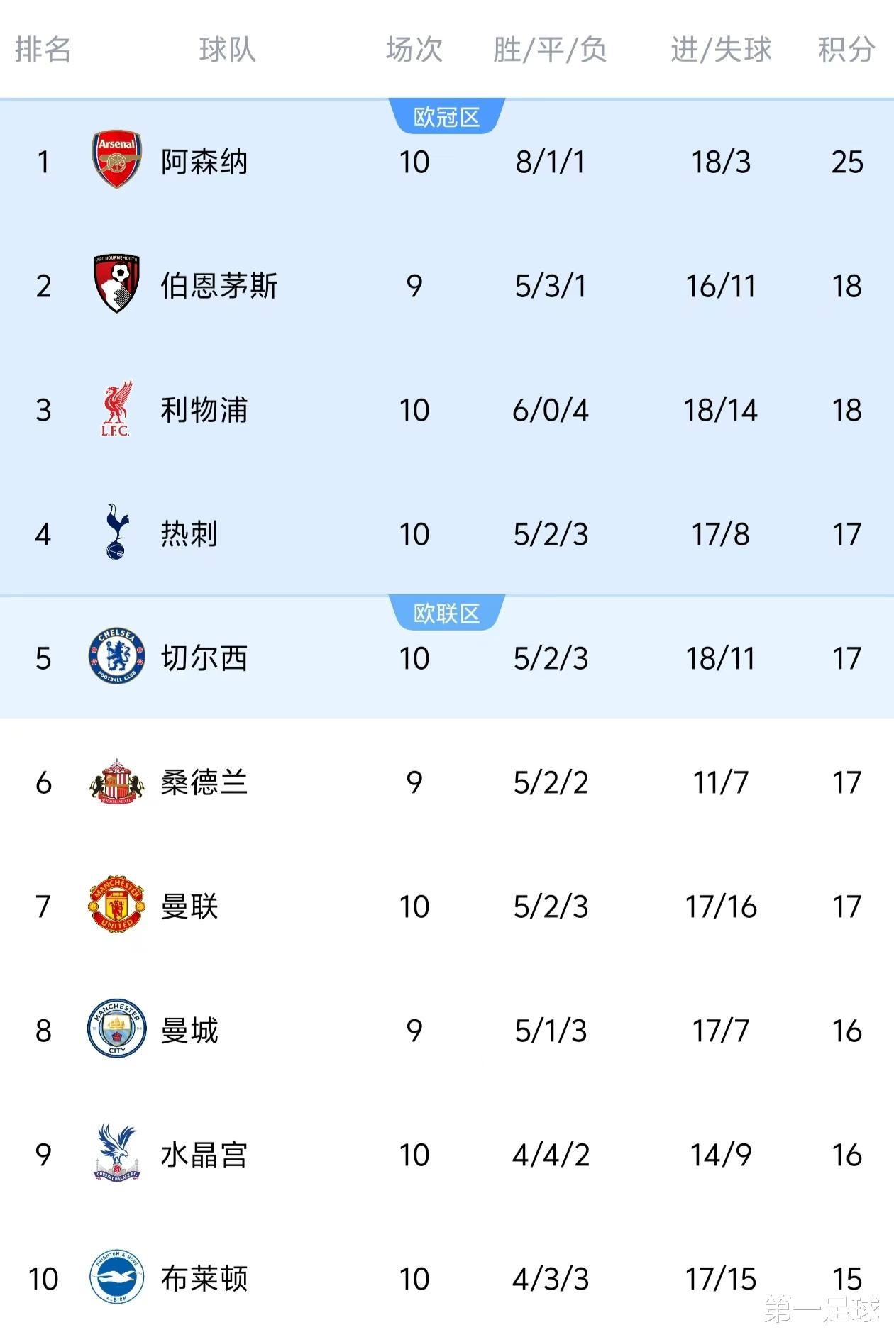 曼城和伯恩茅斯这一场,对排名影响就大了,曼城赢球的话,就可以积19分冲到第二名。整体来说,这赛季的曼城和前几个赛季不太一样,瓜迪奥拉学会苟了,所以它失球数很少,7个丢球,仅仅多过阿森纳。