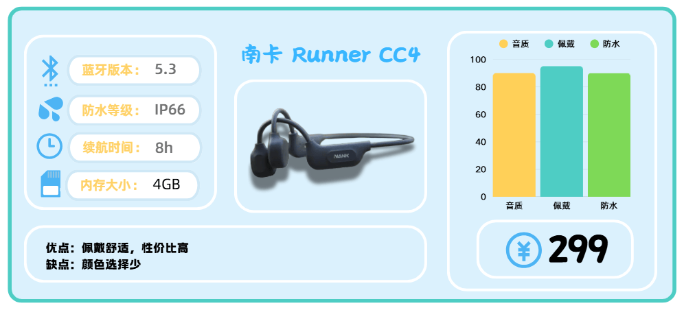 Runner CC4 主打轻量化与舒适佩戴,整机仅 25g,采用开放式不入耳结构,适合长时间运动使用。搭载 蓝牙 5.3 芯片,连接稳定且支持一拖二;具备 AI 智能通话降噪,并配备 4GB 本地内存,无需手机也能随时听歌,是高性价比的运动搭档。