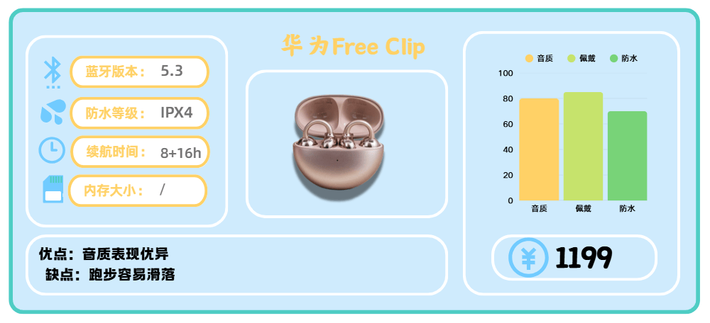 采用少见的夹耳式开放结构,耳机不入耳、无压迫,稳稳卡在耳廓外侧,长时间佩戴仍保持通透舒适。一体式耳夹贴合牢固,跑步、跳跃或高强度训练都不易掉落;同时不影响佩戴眼镜,对通勤与运动场景都十分友好。