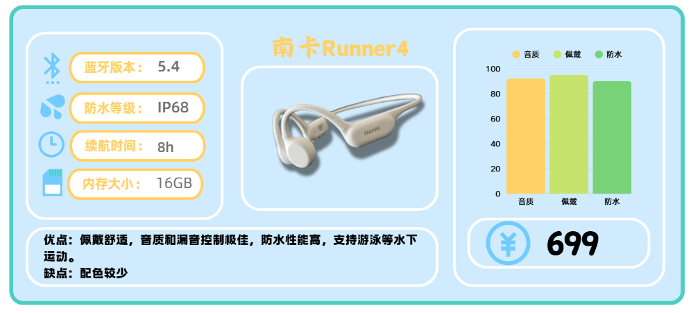 不同于传统耳机的空气传声,骨传导耳机依赖骨骼振动来传递声音。南卡在此基础上进行了深度调校,内置高性能旗舰级骨振子,使音效更具包围感与空间感。无论是跑步时的节奏感音乐,还是日常的有声书、播客,Runner4 都能提供清晰而沉浸的听觉享受,在同级产品中展现出极强的竞争力。