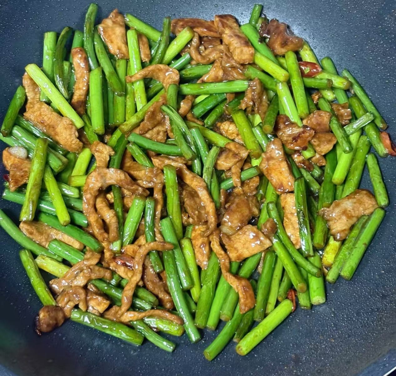 火候是“灵魂鼓点”。锅烧到冒青烟,两勺油沿锅边滑一圈,下肉片“滋啦”一声,像主持人开场白,快速划散至变色,先盛出——这叫“半程美学”,留住肉汁。留底油爆香蒜末,蒜苔倒进去大火“翻炒三十下”,能听到“咔嚓咔嚓”的脆响,像春天在锅里拍微电影。肉片回锅,沿锅边淋半勺生抽、三分之一勺蚝油,再撒“灵魂伴侣”——七八粒豆豉,它们像“老戏骨”,咸香瞬间把蒜苔的“青味”收编。最后勾薄芡,让酱汁挂成“丝绸雨衣”,关火,撒一把新鲜蒜末,热气把蒜香冲得扑鼻,像给整道菜按了“增强键”。