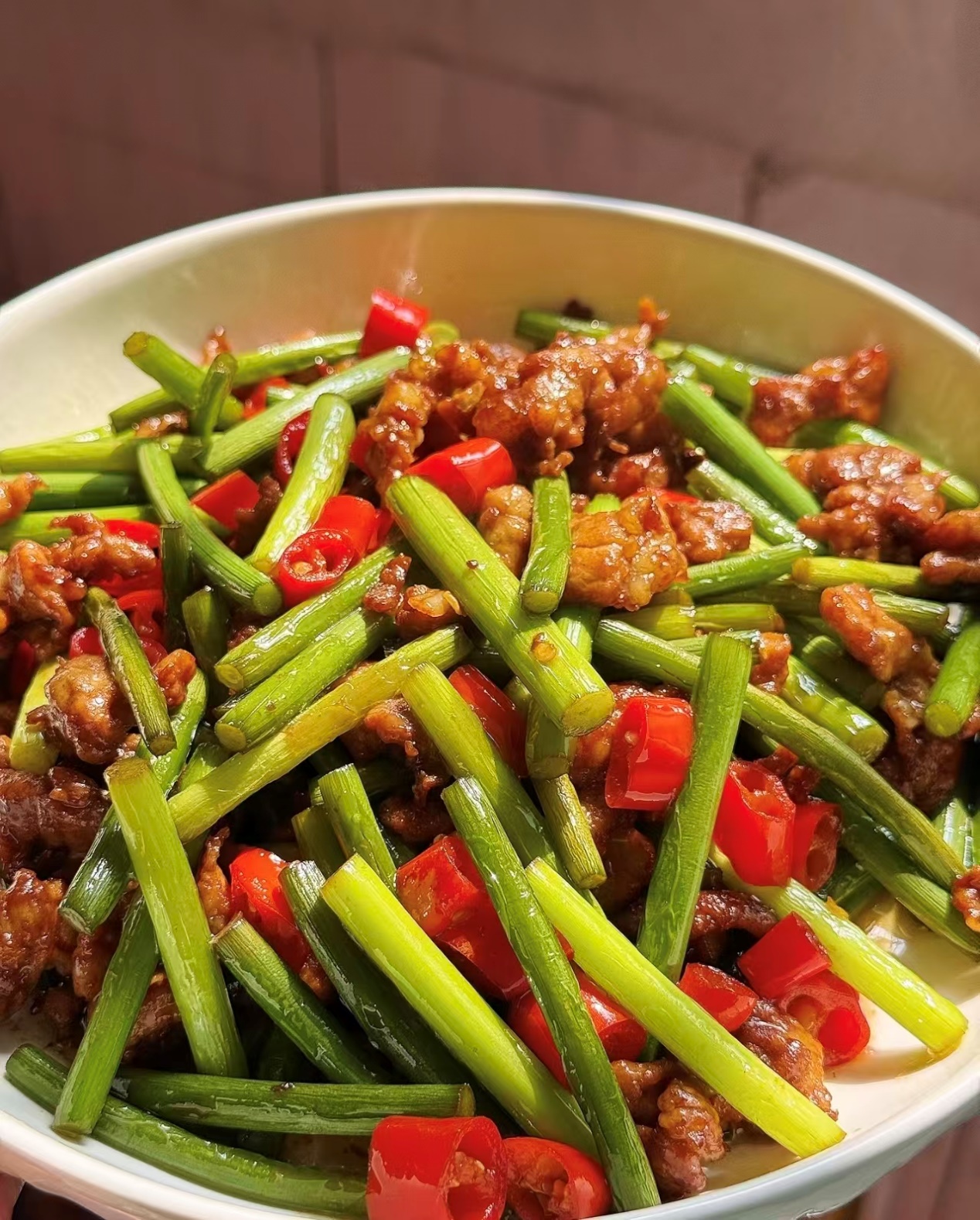 装盘别急着端走。把蒜苔段“站”成一圈,肉片堆成“小山丘”,顶上丢几粒红椒圈,颜色瞬间从“绿野仙踪”跳到“圣诞贺卡”。夹一筷子,蒜苔断口整齐,露出“小水坑”,咬下去“咔嚓”一声,汁水溅到舌尖,清甜先冒头;肉片裹着豆豉的酱香,嫩到“踮脚”,牙齿刚碰到就断成两截,连平时最挑剔的“牙套弟”都喊:“不塞牙!我可以干三碗饭!”