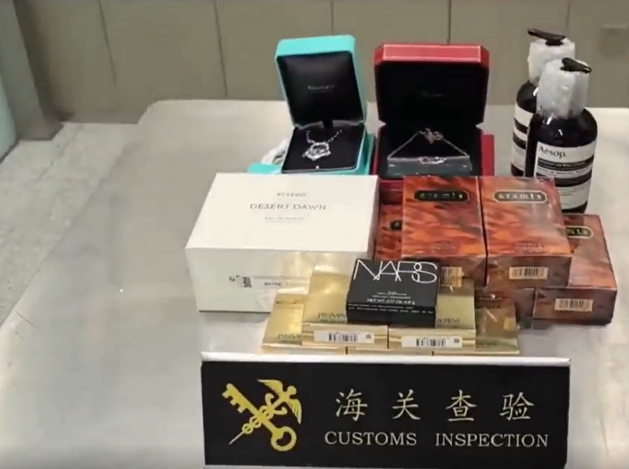 经查验,在旅客行李内发现有奢侈品首饰盒及化妆品等,旅客羽绒服内层口袋中有一件高价值项链。