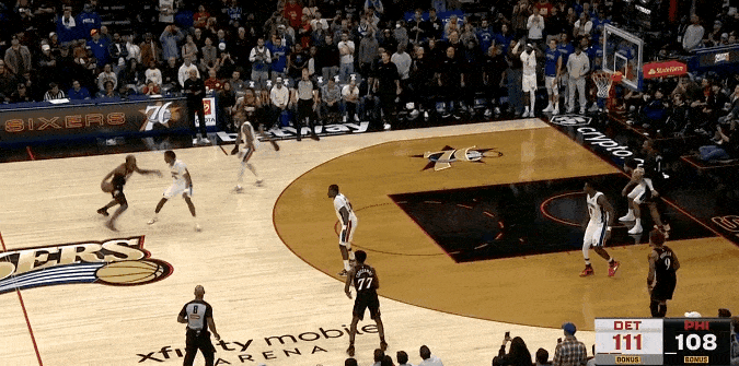 NBA常规赛,76人对阵活塞的比赛正在进行中。