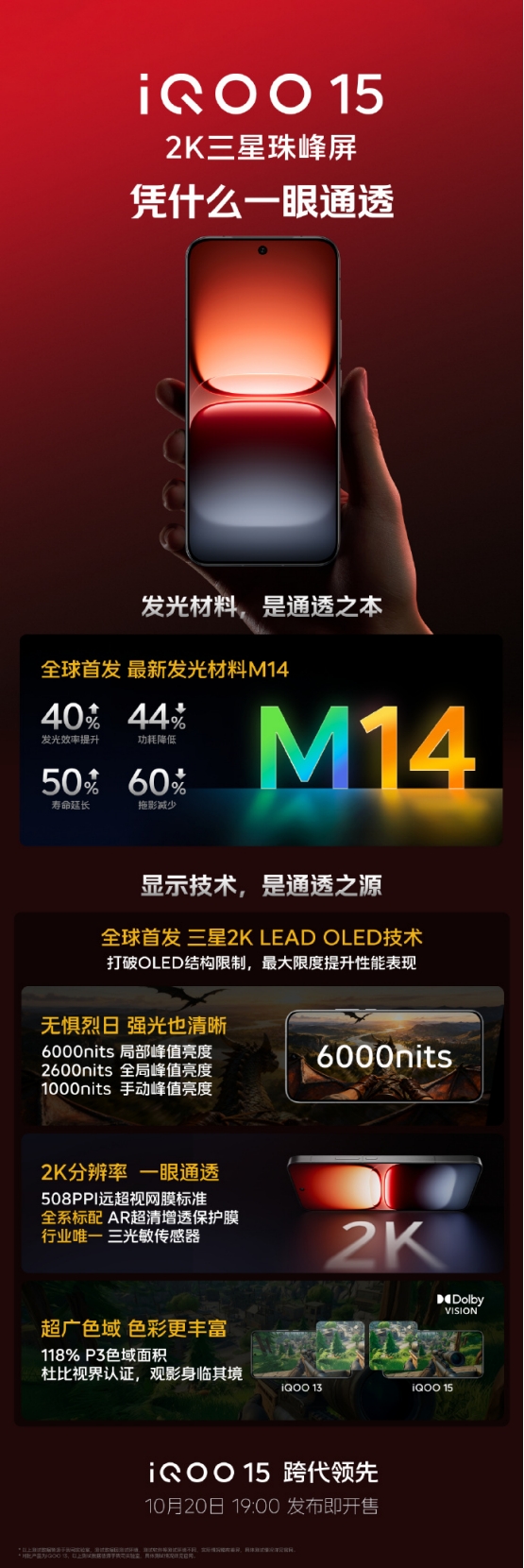 视觉方面,iQOO 15将首发三星2K LEAD OLED“珠峰屏”。这块屏幕不仅细腻通透,更具备惊人的亮度表现——全局峰值亮度高达2600nits,局部峰值甚至突破6000nits。即便在强光环境下游戏,画面依旧清晰可见,细节分毫毕现。同时,它还通过了TÜV莱茵无频闪与无偏振显示认证,真正做到了“硬件级护眼”。