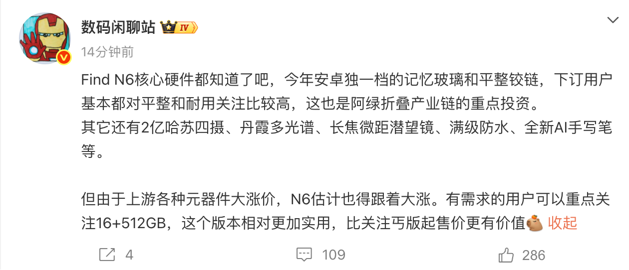 值得一提的是,数码闲聊站剧透:上游元器件涨价导致 Find N6 售价大概率上涨,但16+512GB 版本才是最实用的选择,比起纠结丐版起售价,这个版本的续航、存储和性能表现更能支撑长期使用,性价比更高。
