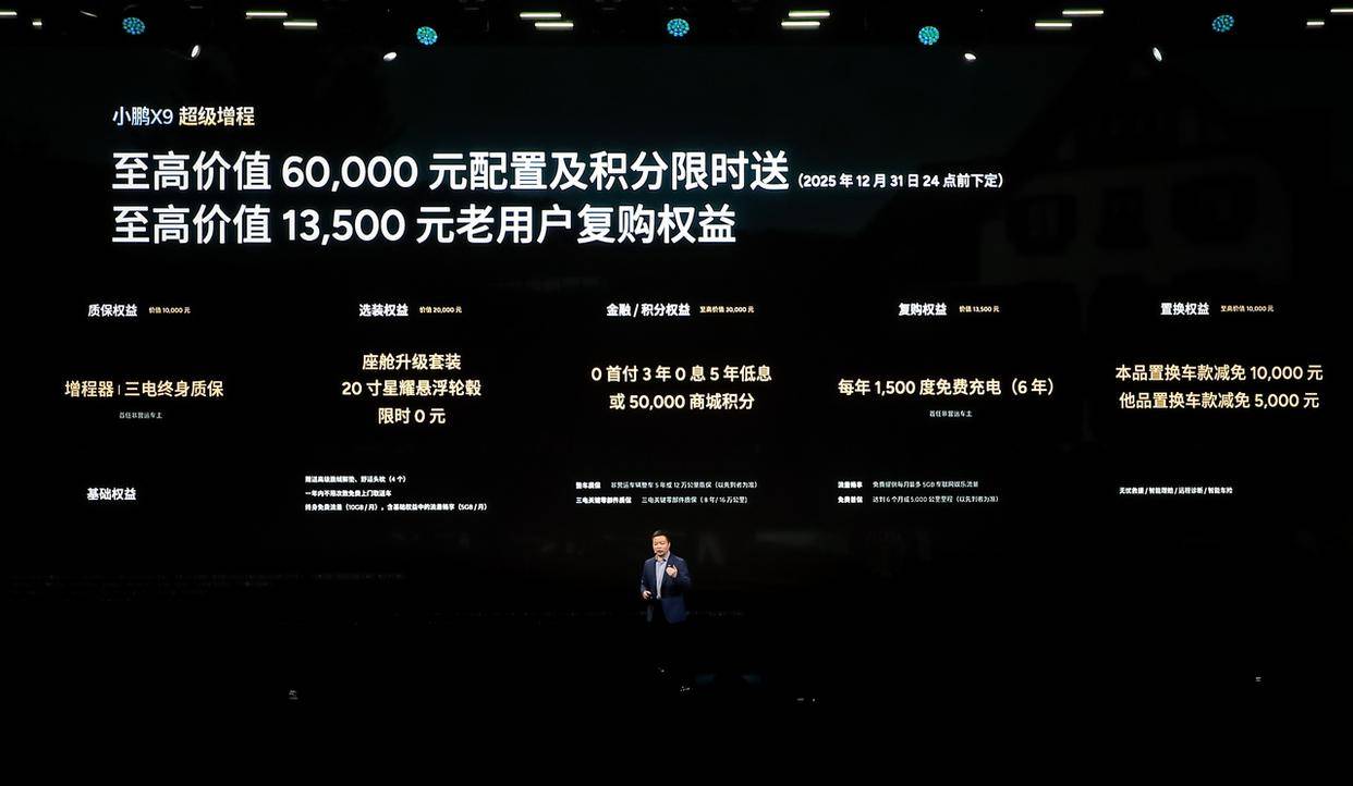 11月20日,全球续航最长大七座——小鹏X9超级增程正式上市!新车共推出Max版和Ultra版两个版本,官方指导售价分别为30.98万元和32.98万元。小鹏汽车同步推出多重上市权益及丰富购车礼遇:即日起至2025年12月31日24点前下定,可享受至高价值60000元配置及积分权益:增程器和三电系统终身质保权益价值10000元;座舱升级套装+20寸星耀悬浮轮毂选装权益价值20000元限时免费;0首付3年0利息5年低利息金融权益或50000商城积分权益至高价值30000元。更有老用户还可享受至高价值23500元的复购权益:每年1500度免费充电6年有效期的复购权益价值13500元;本品置换车款减免10000元和他品置换车款减免5000元。
