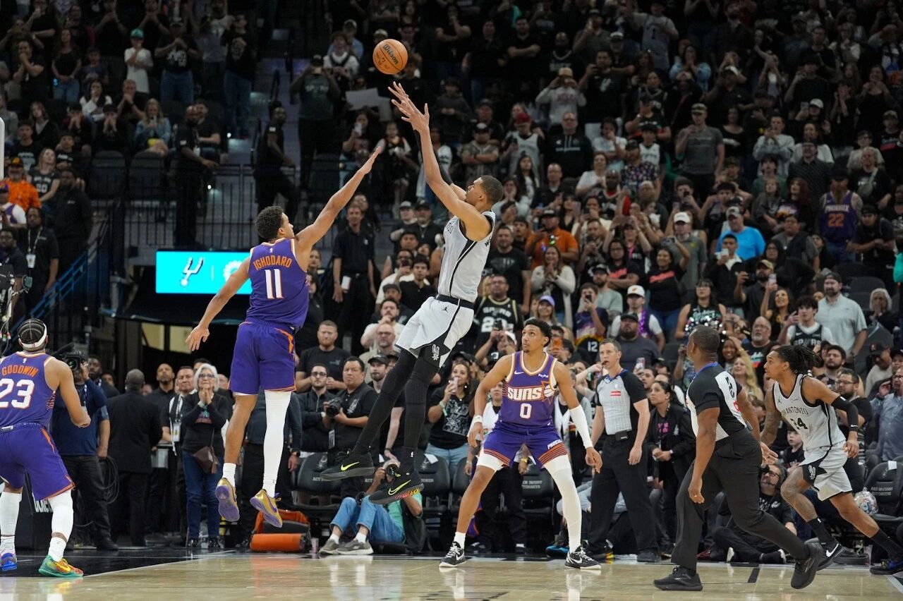 ——太阳进攻回合,吉莱斯皮一顿狂运,到内线后发现有文班亚马急忙传球,最终这一回合以布克迎着瓦塞尔三分强投打铁告终