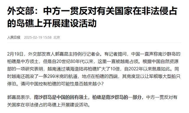 对此,外交部发言人郭嘉昆回应表示,南沙群岛是中国固有领土,柏礁是南沙群岛的一部分,中方一贯反对有关国家在非法侵占的岛礁上开展建设活动。