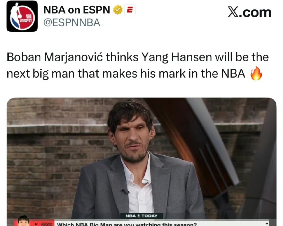 近日,前NBA球员博班-马扬诺维奇参加了ESPN的节目,在节目中盛赞了杨瀚森,并表示杨瀚森的选秀顺位应该高于16位,但杨瀚森经纪人团队的预测是45—50位。在节目中好好的夸了夸杨瀚森,球迷对此也是调侃到:博班这是想要中国代言了。