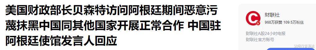 财联社报道,美国那边的财政部长贝森特,跑到阿根廷去的时候,居然对中国和其他国家的正常合作说三道四,净讲些不实之词。咱们中国驻阿根廷的大使馆发言人,对此直接给怼回去了。