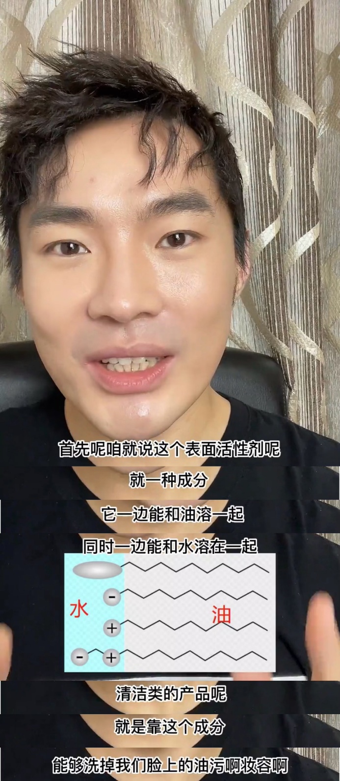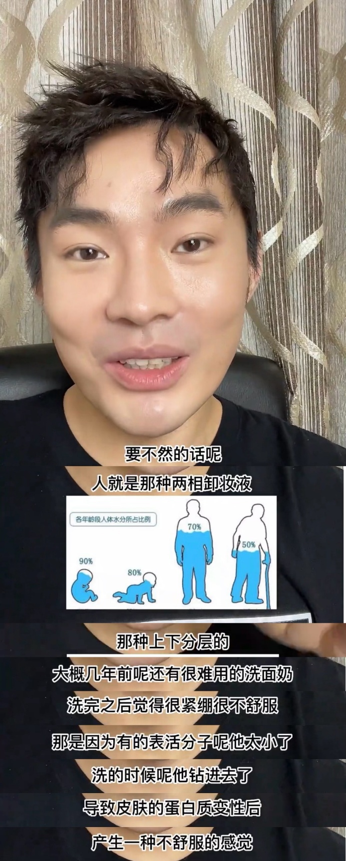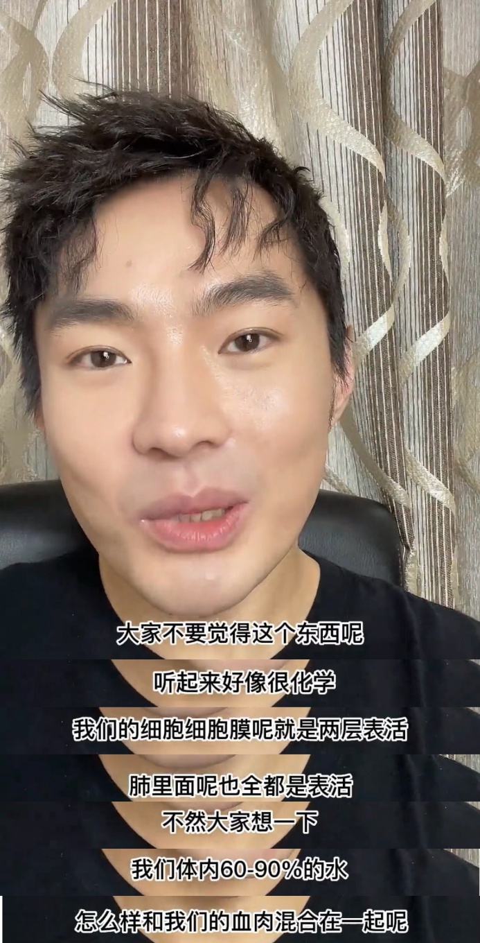 但大家想一下,我们体内90%的水怎么样和我们的血肉混合在一起呢?要不然的话,就是那种两相卸妆液那种上下分层的状态。在几年前还有很难用的洗面奶,洗完之后觉得很紧绷、很不舒服。那是因为有的表活分子太小了,洗的时候它钻进去了,导致皮肤的蛋白质变性后产生一种不舒服的感觉。