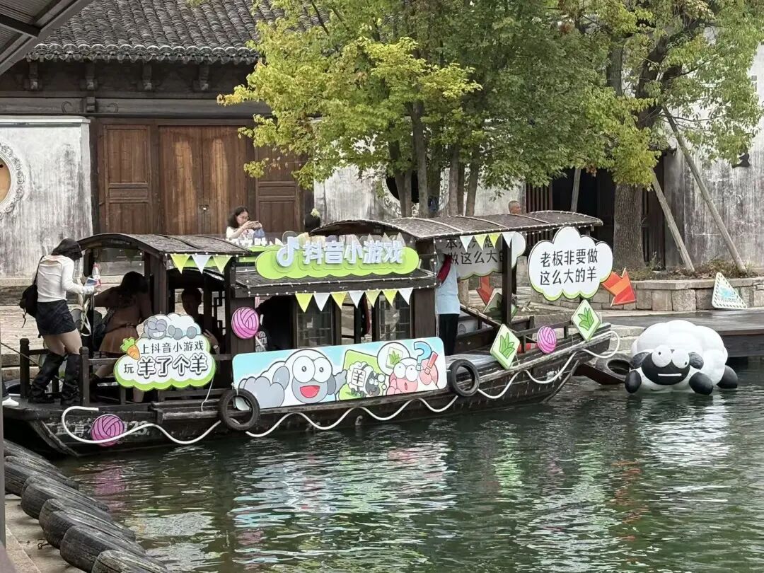 游客们步入小镇,首先映入眼帘的便是极具视觉冲击力的“小游戏痛船”——抖音上火爆的《羊了个羊》、《抓大鹅》等小游戏IP,将古朴的游船装扮成移动的潮流符号,等待体验的游客排起长龙,只为在江南水乡中体验一把“游戏皮肤”的现实版。