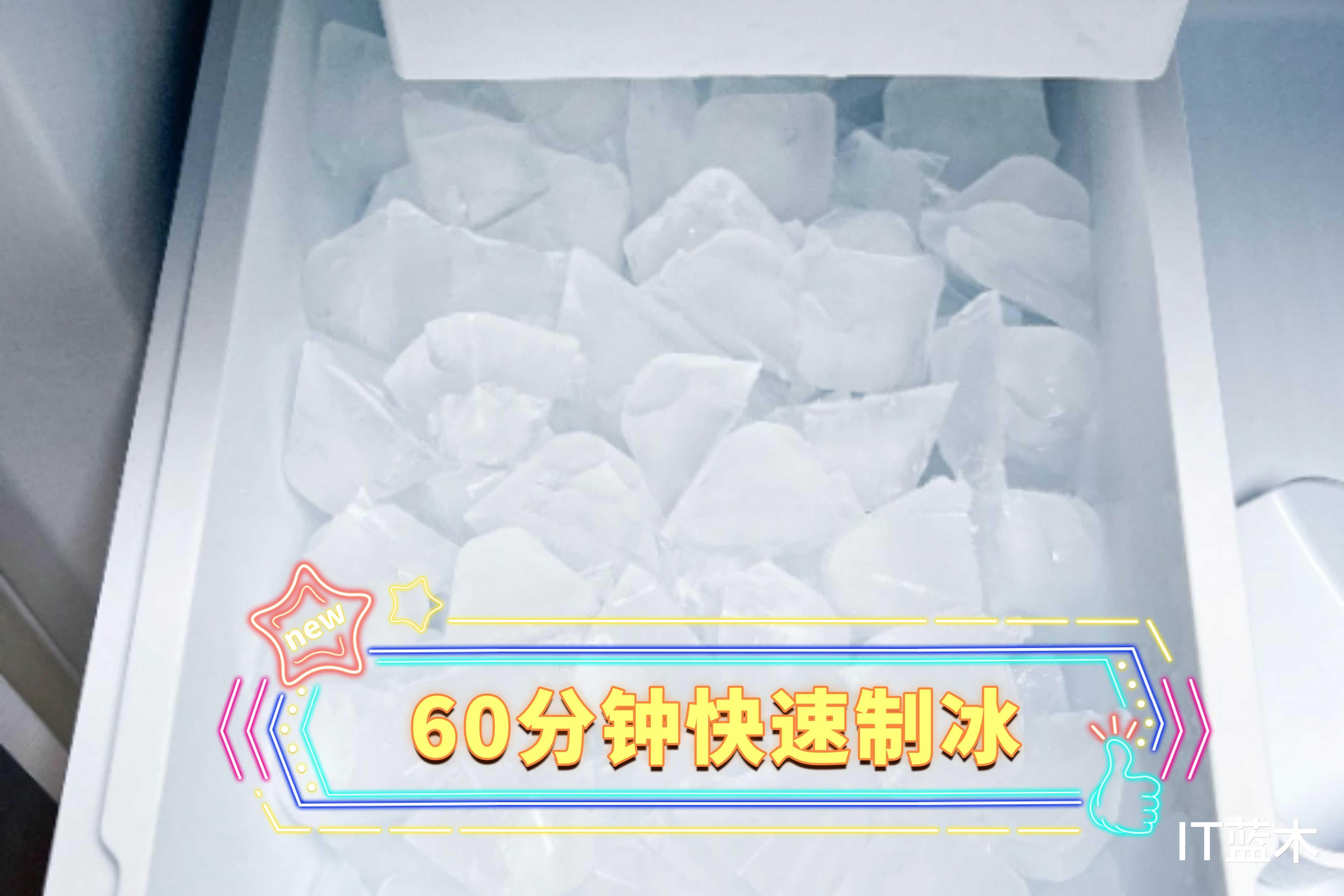 60分钟极速出冰,储冰盒最多能存110块冰,颗粒分明不粘连;