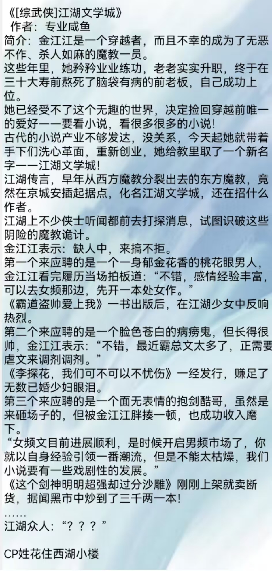 三、《[综武侠]江湖文学城》作者:专业咸鱼文章字数:255091字(完结)