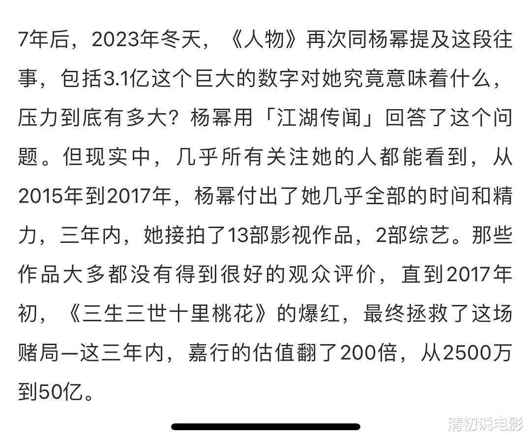 那三年,杨幂很拼。她疯狂接戏、拍广告、上综艺,带领嘉行传媒估值从2500万飙升至50亿,增长了200倍。