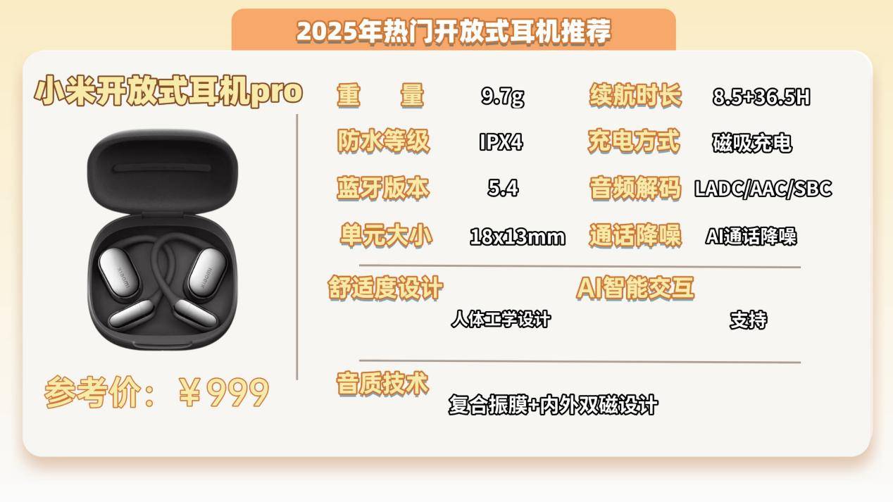 作为国民科技代表,小米将多年积累的声学技术拓展到开放式耳机领域,推出业内首创的五单元声学系统,表现相当出色。耳机采用18×13mm定制大动圈单元,低频震撼有力,振膜面积是普通动圈的两倍,鼓点饱满如同迷你音箱。同时配备双动铁单元与压电陶瓷高音模块,能够精准还原人声齿音及乐器泛音细节,由哈曼金耳朵团队精心调校,并通过Hi-Res Audio高清音质认证。为解决开放式耳机易漏音问题,耳机内置10mm独立防漏音单元,结合反相声波抵消技术,在50%音量下,漏音范围控制在约25厘米内。