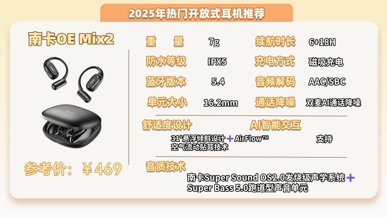 在音质表现上,市面上多数开放式耳机虽然轻盈透气,但音质与功能表现相对单薄,仅满足基础听音。而南卡OE Mix2则率先引入全能AI智能交互系统,搭载多模态AI架构,支持语音沟通、实时翻译与图像生成等功能,让耳机从“听音设备”进化为“随身AI助手”。