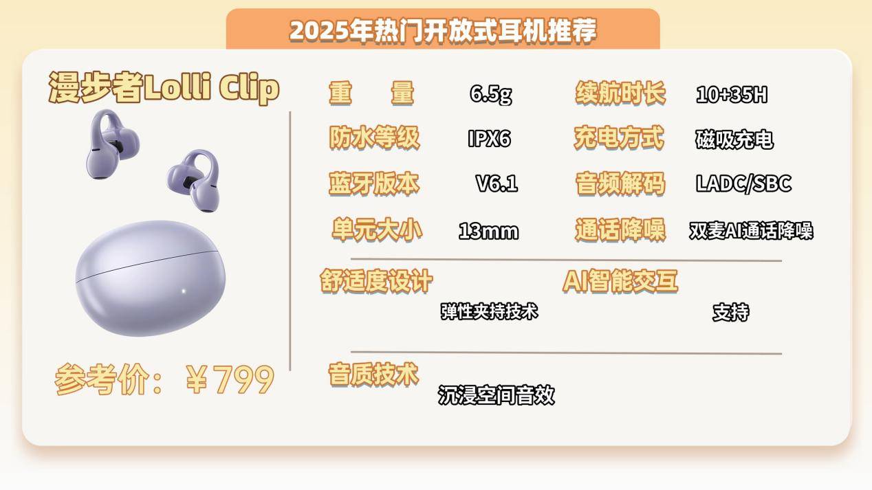 续航表现同样出色,耳机总续航可达32小时,支持快充满足临时补电需求。机身具备IPX6防水等级,应对运动出汗或小雨环境毫无压力。此外,耳机支持低延迟游戏模式和双设备连接,通话端配备AI降噪,同时拥有主动降噪功能,让日常通话清晰度大幅提升。整体来看,Lolli Clip兼顾音质与降噪,功能全面,是少数高性价比的开放式耳机选择。